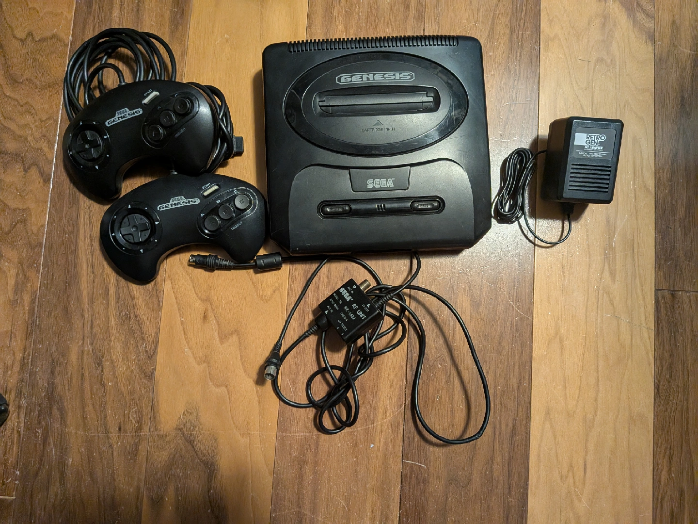 469Works well. Comes with 2 controllers, power supply, and video cable. Sonic game is just shown to be working, it is not included. Console is in good condition, the controllers don't seem to have any issues.