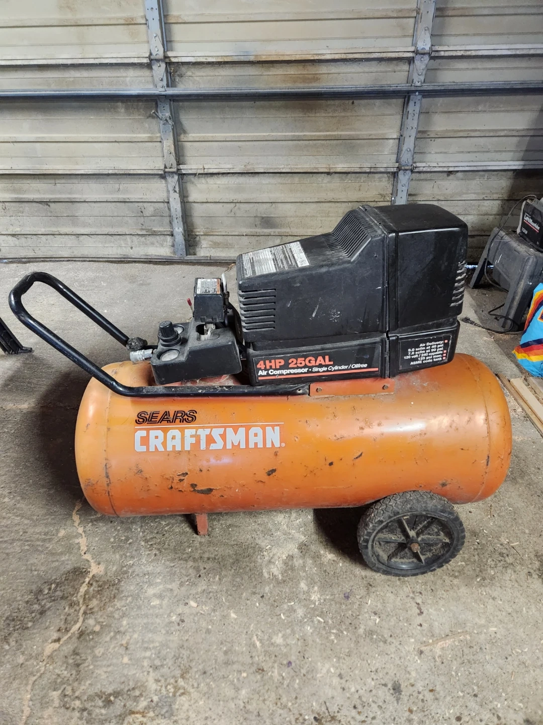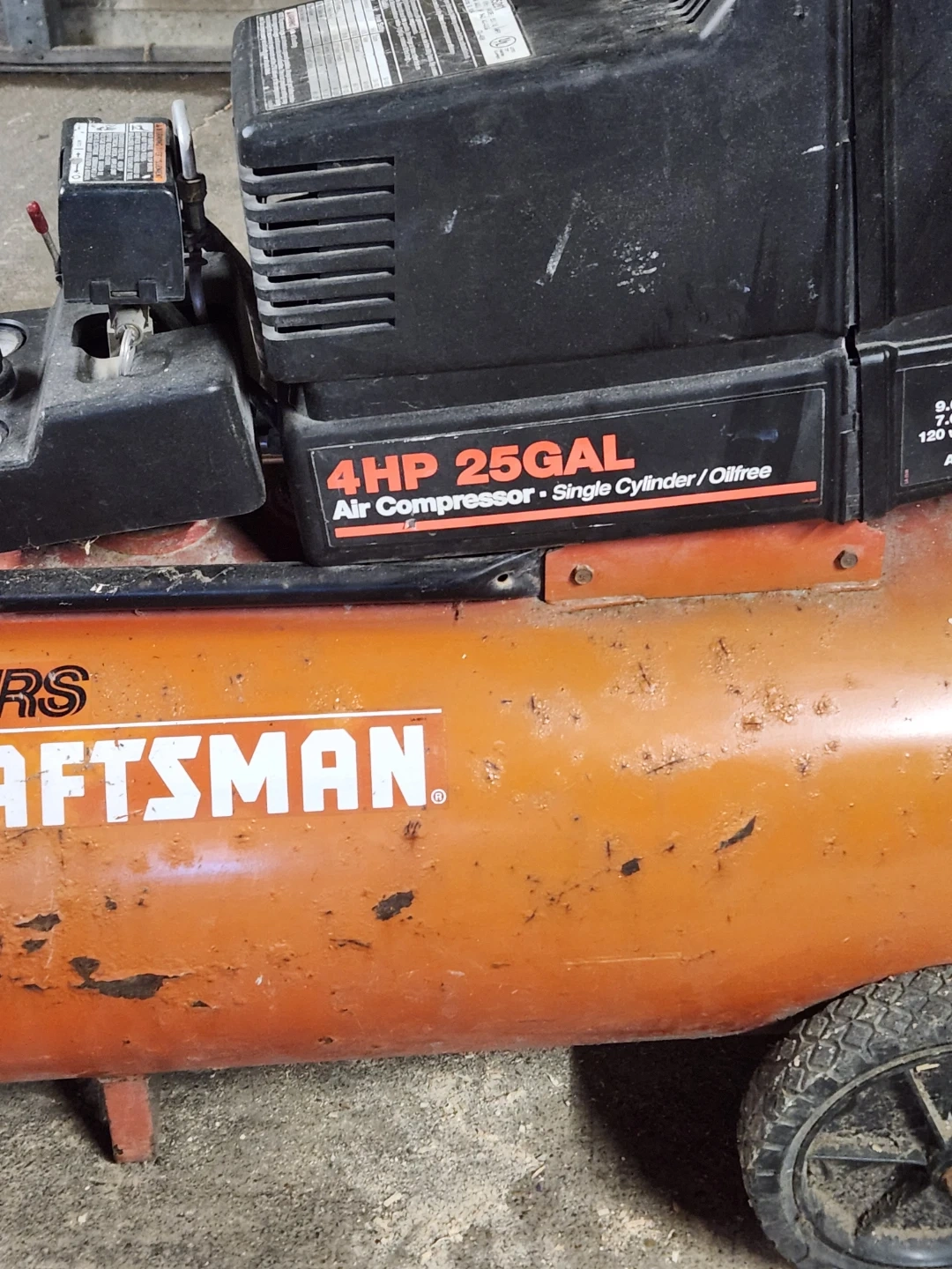 Craftsman 4HP air compressor with a 25-gallon tank. It's a single cylinder, oil-free model. Unit has a handle and wheels for portability.