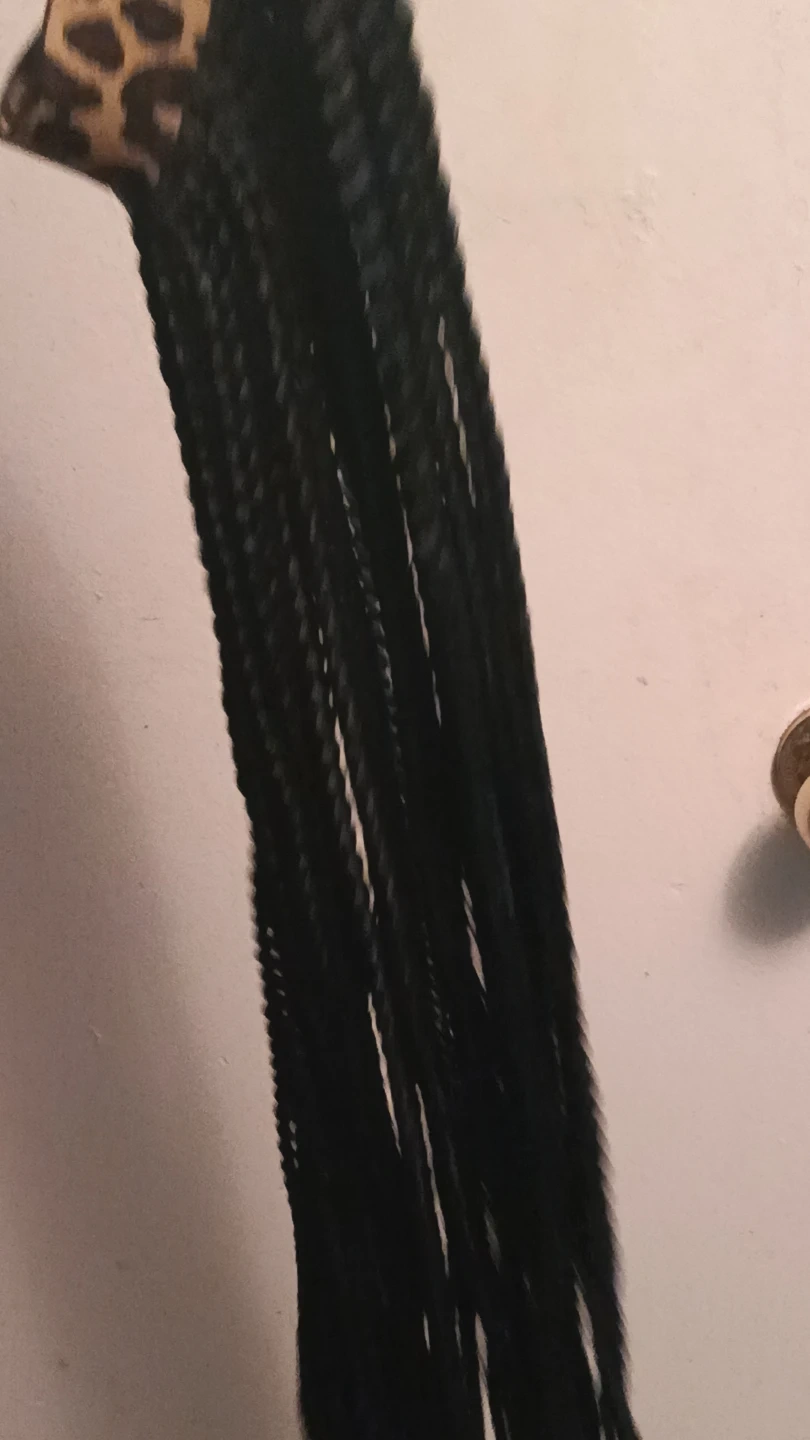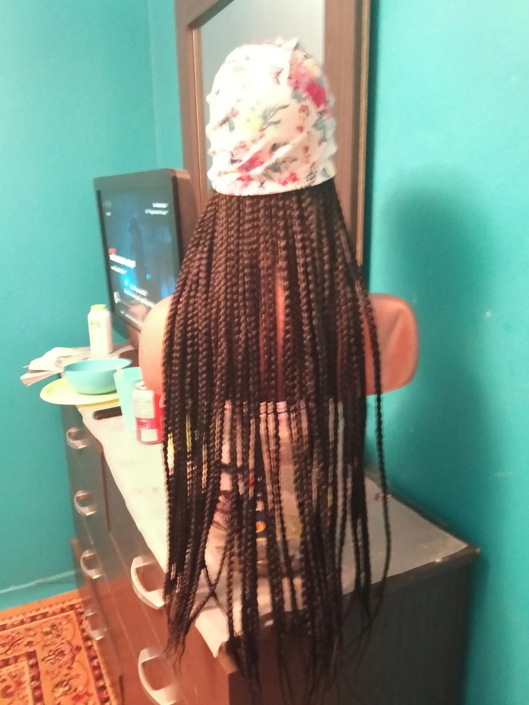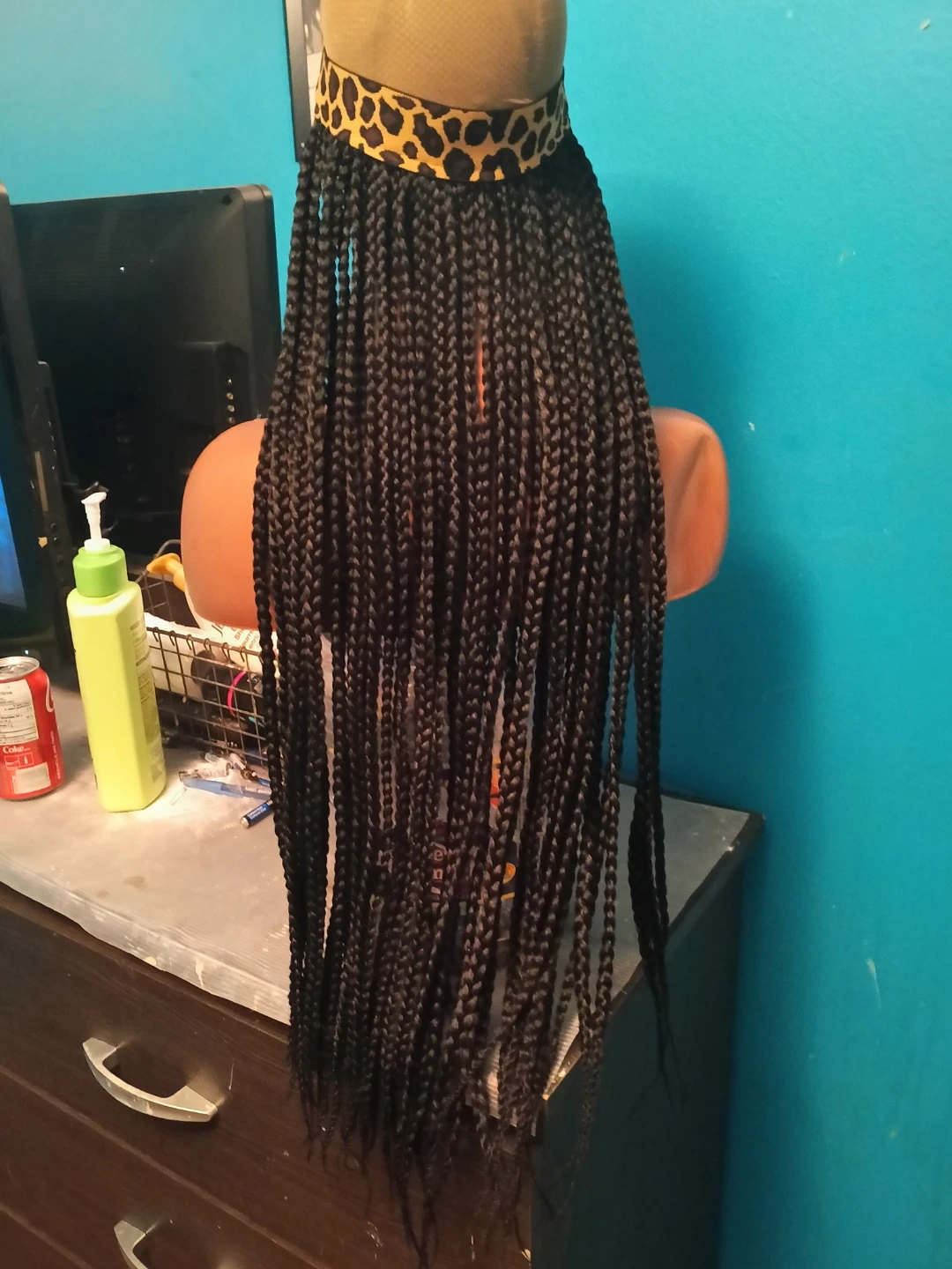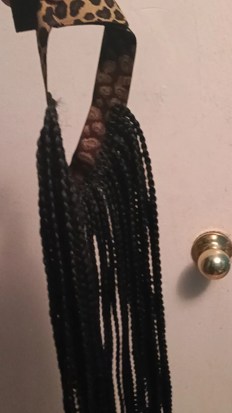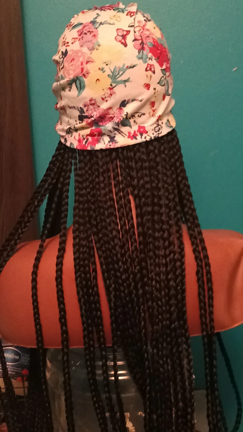 I have a floral turban and a braided wig available. The turban features a beautiful floral design with a central rose detail. The wig has long, black braids and a leopard print headband. It's a stylish combination!