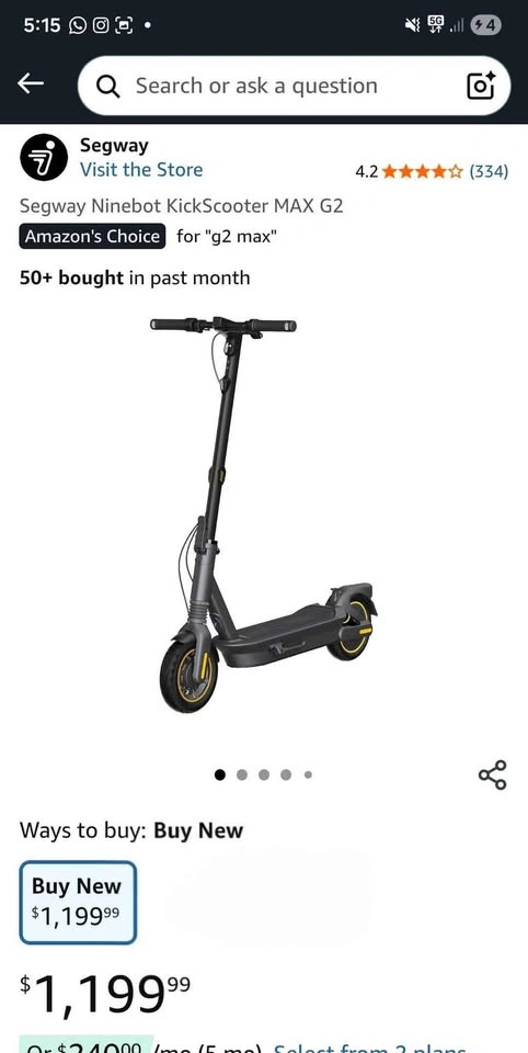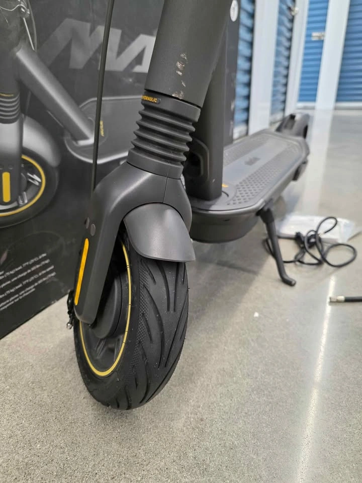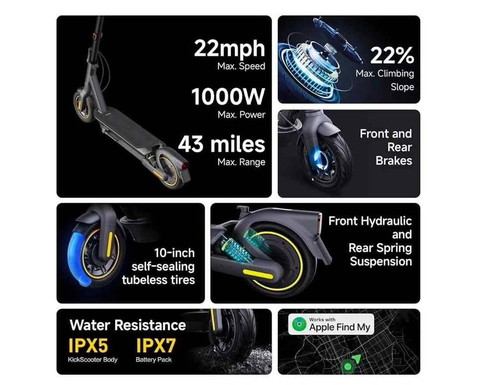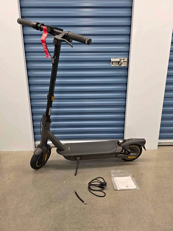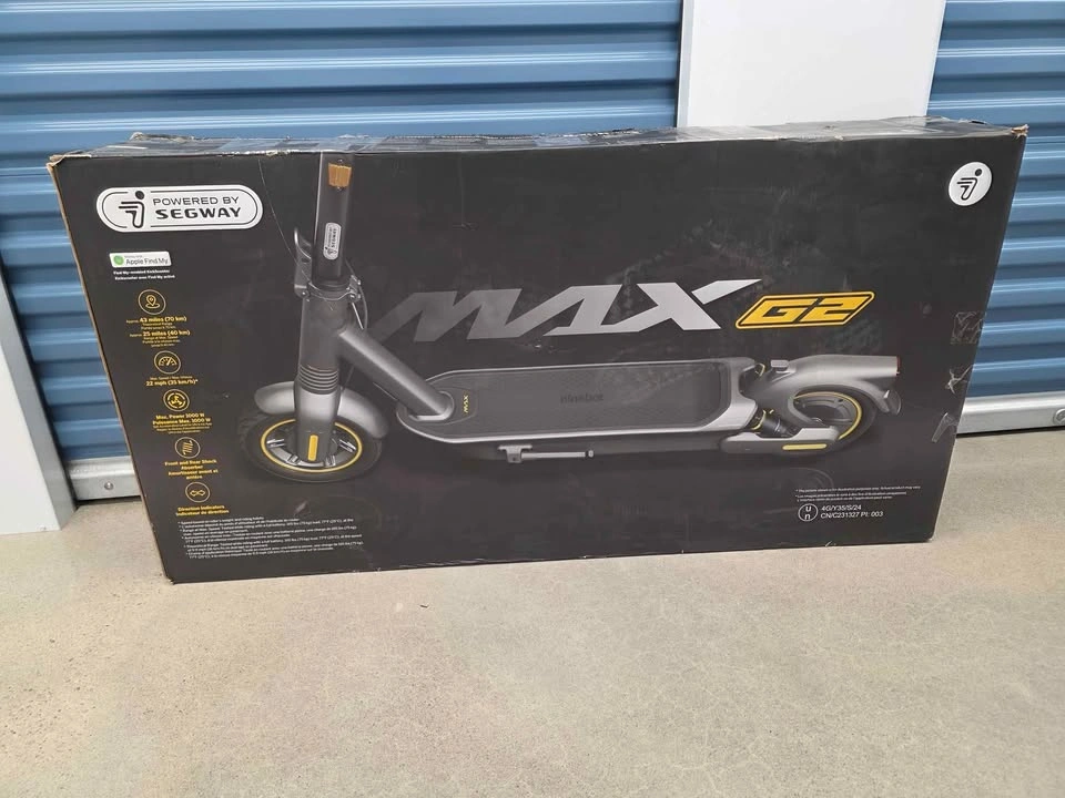 49High-performance electric scooter built for comfort, range, and power. Features a 1000 W motor, 43-mile (70 km) max range, and 22 mph (35 km/h) top speed. Comes with front hydraulic + rear spring suspension, 10-inch self-sealing tubeless tires, and IPX5/IPX7 water resistance. Lightly used — only 318.5 km total mileage (verified via Segway app). Some cosmetic scuffs shown in photos, but rides perfectly and includes original box, charger, and manual. Pulled from a liquidation pallet. Specs: Motor Power: 1000 W (Max) Range: 43 miles / 70 km Top Speed: 22 mph / 35 km/h Max Slope: 22% Tires: 10” self-sealing tubeless Suspension: Front hydraulic + rear spring Water Resistance: IPX5 (body) / IPX7 (battery) Weight Limit: 265 lbs Retail Price: $1,199 CAD