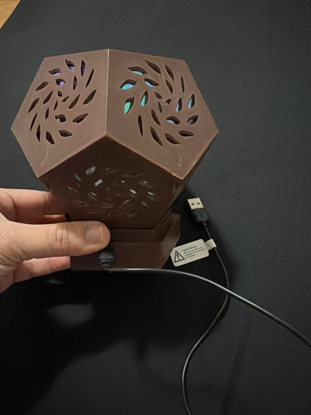 Brown hexagonal decorative lamp with cut-out leaf pattern. It's powered by USB and has colored lights that shine through the openings. Perfect for adding a cozy ambiance!