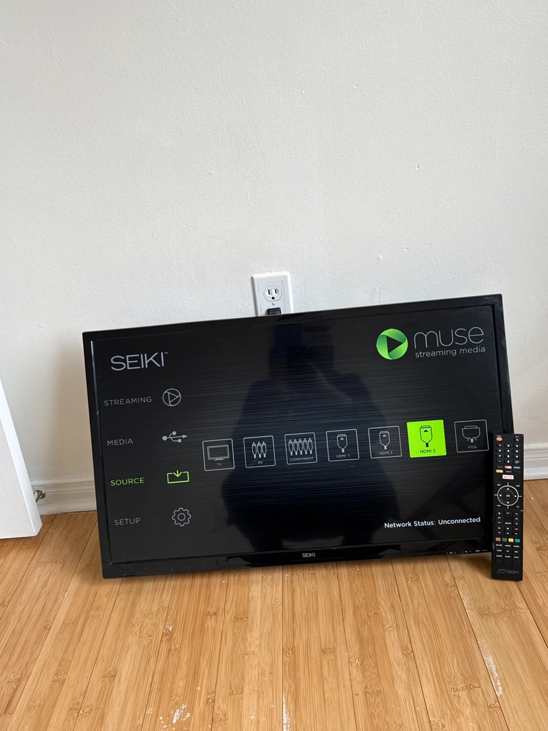 Selling a Seiki TV with Muse streaming media. It comes with a remote. The TV has ports for component, HDMI 1, HDMI 2, HDMI 3, and VGA. Network status is unconnected.