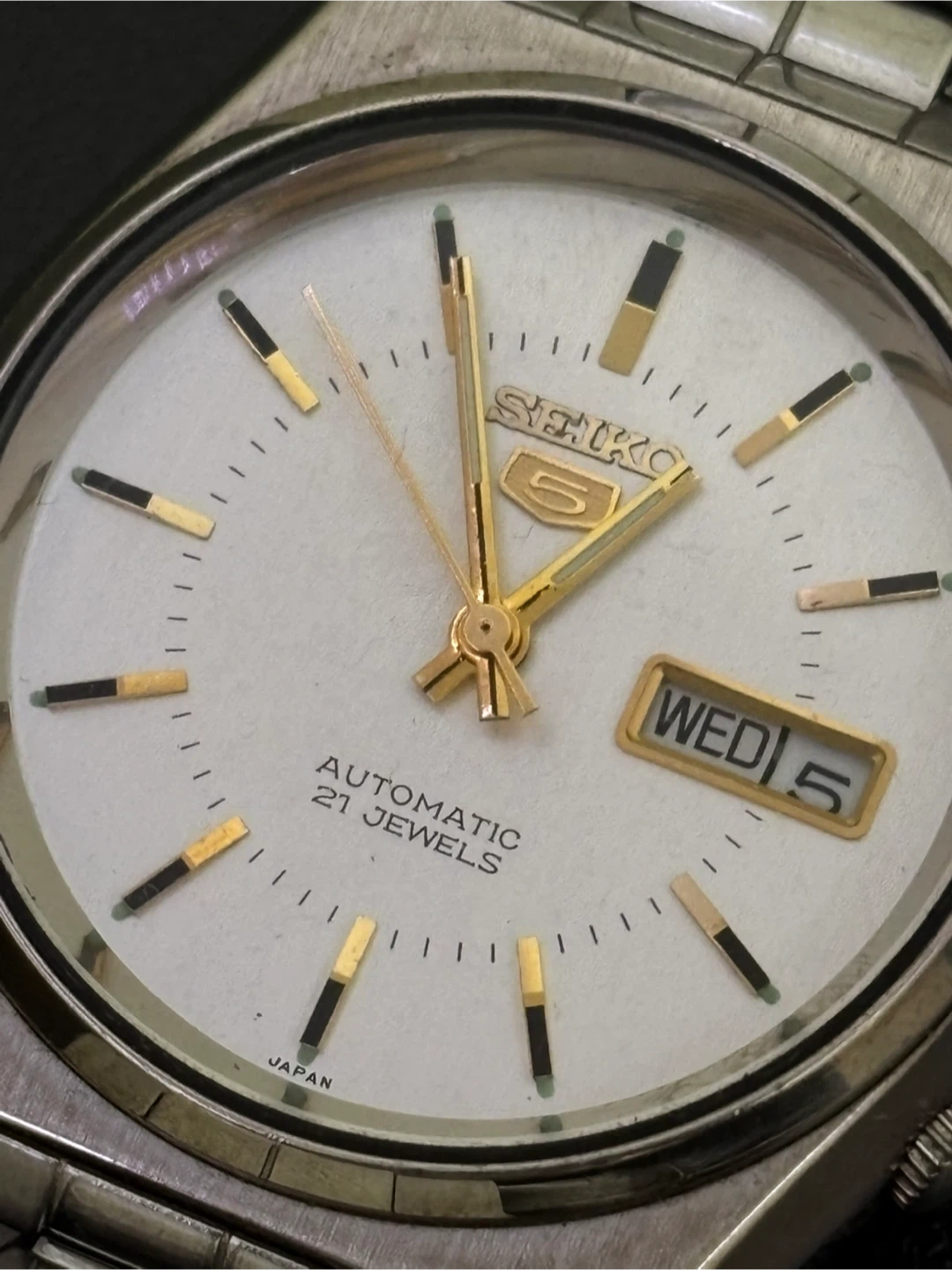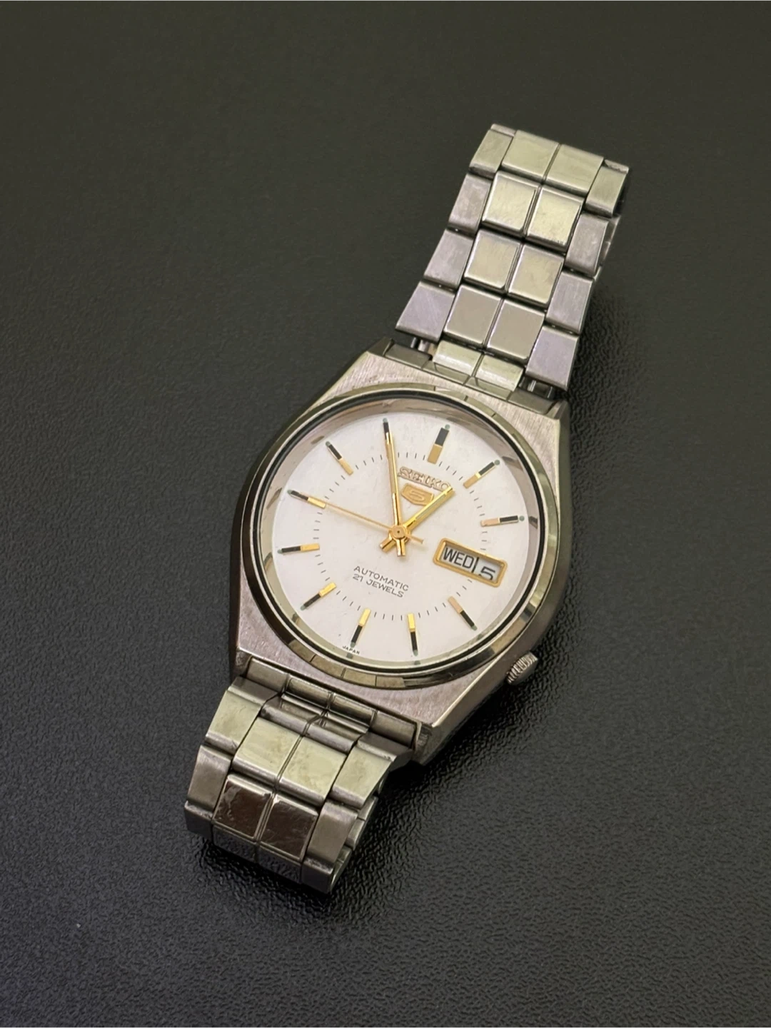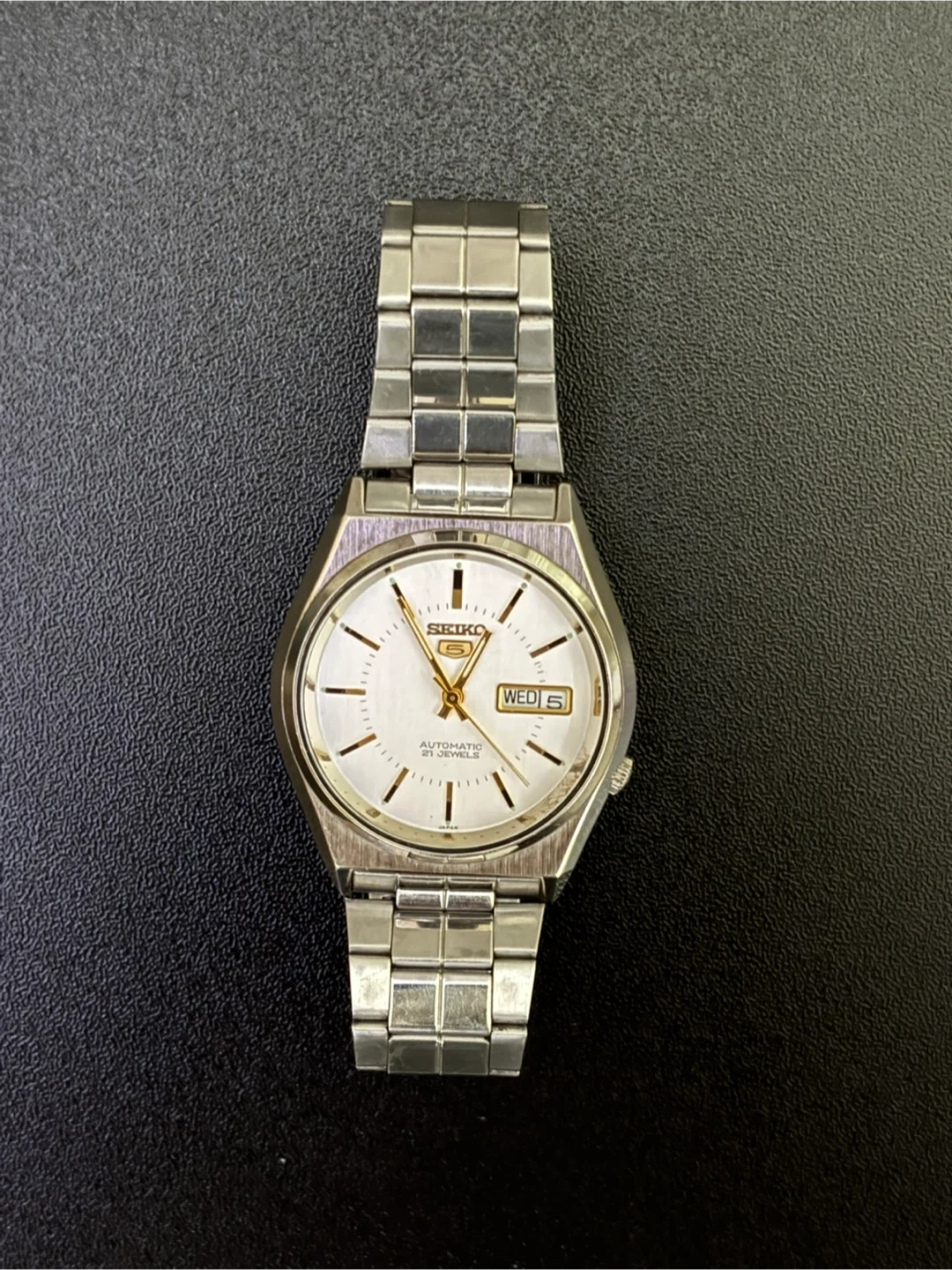 83A classic everyday automatic men’s watch from Seiko’s famous “5” line, powered by a 21‐jewel automatic movement. The stainless steel case and bracelet give it a clean, versatile look, and the fixed day + date windows add practical functionality. Features: • Automatic (self-winding) movement, 21 jewels. • Day & Date display. • Stainless steel case & bracelet. • Classic silver-toned dial (with gold accents) and polished hands and hour markers. • Reliable Seiko engineering and heritage. Condition: – Pre-owned, showing visible scratches and wear on the case and bracelet (please inspect photos for details). – The crystal appears free of major cracks; minor surface marks may be present. – Bracelet shows surface wear/links polishing wear. – The movement runs and keeps time (please consider that automatic watches may deviate several seconds per day unless recently regulated). Pickup: 300 Kingston Road in Pickering. No lowballs, DM for questions.