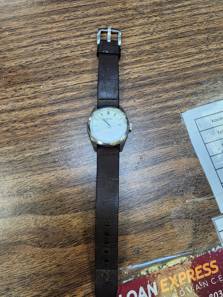 This is a Seiko automatic watch with a brown leather strap. The watch is water resistant to 10 bar. The watch has a white dial. The case is stainless steel. The watch has a date window at the 3 o'clock position. The watch is in good condition. The watch is currently working. no battery needed. Amazing low Price: First come first, serve, open to Offers ***All purchases must be finalized in-store*** We accept cash only We don't have machines in our store! Please bring cash only to 107loancentre@gmail.com Location & Hours 107 Loan Centre 10852 97 Street Edmonton, Alberta T5H2M5 (780) 990-1717 Store (825) 925 - Loan ( 5626 ) Mobile 107loancentre@gmail.com Hours or Times Monday 10:00 a.m .-  6:00 p.m. Tuesday 10:00 a.m .-  6:00 p.m. Wednesday 10:00 a.m .-  6:00 p.m. Thursday 10:00 a.m .-  6:00 p.m. Friday 10:00 a.m .-  6:00 p.m. Saturday 10:00 a.m - 4:00 p.m. Sunday Closed Here is a list of the items we sell Power tools * Milwaukee * Dewalt * Makita and more Electronics * Stereo, * Mp3 , * IPad, * Laptop, * Desktop * Monitors , * TV,  * DvD ,  Blu - ray player * Speakers Antiques * watches Collectibles * Jerseys * Comics book * Hockey cards Home furniture's *  Bed ,nightstands , dressers *  New & Used Mattress & Boxspring *  Couch & coffee table Sporting goods * Baseball glove & bat * soccer ball * golf clubs * Fishing rod & baits Music Instruments * Drums * Acoustic or electric guitar * Double base * Caribbean metal drum. and more Please Come visit us !
