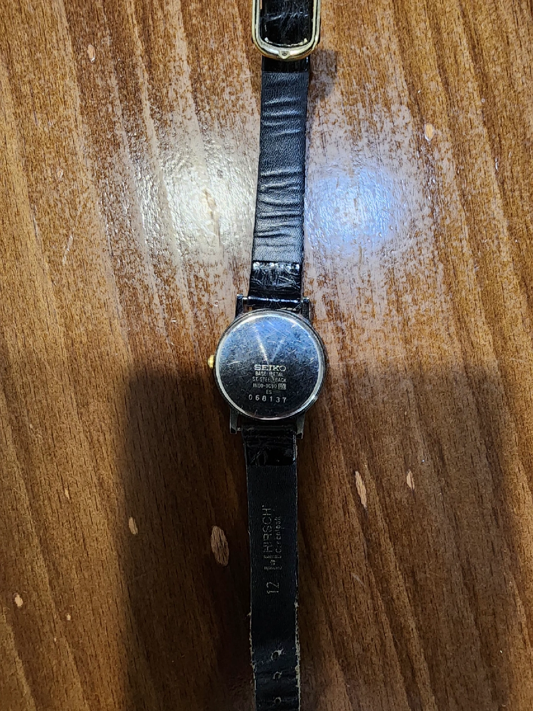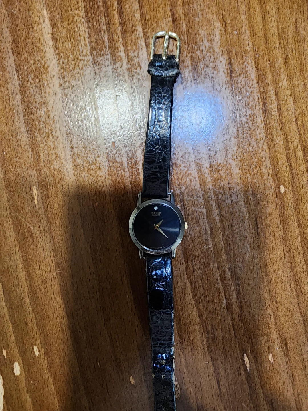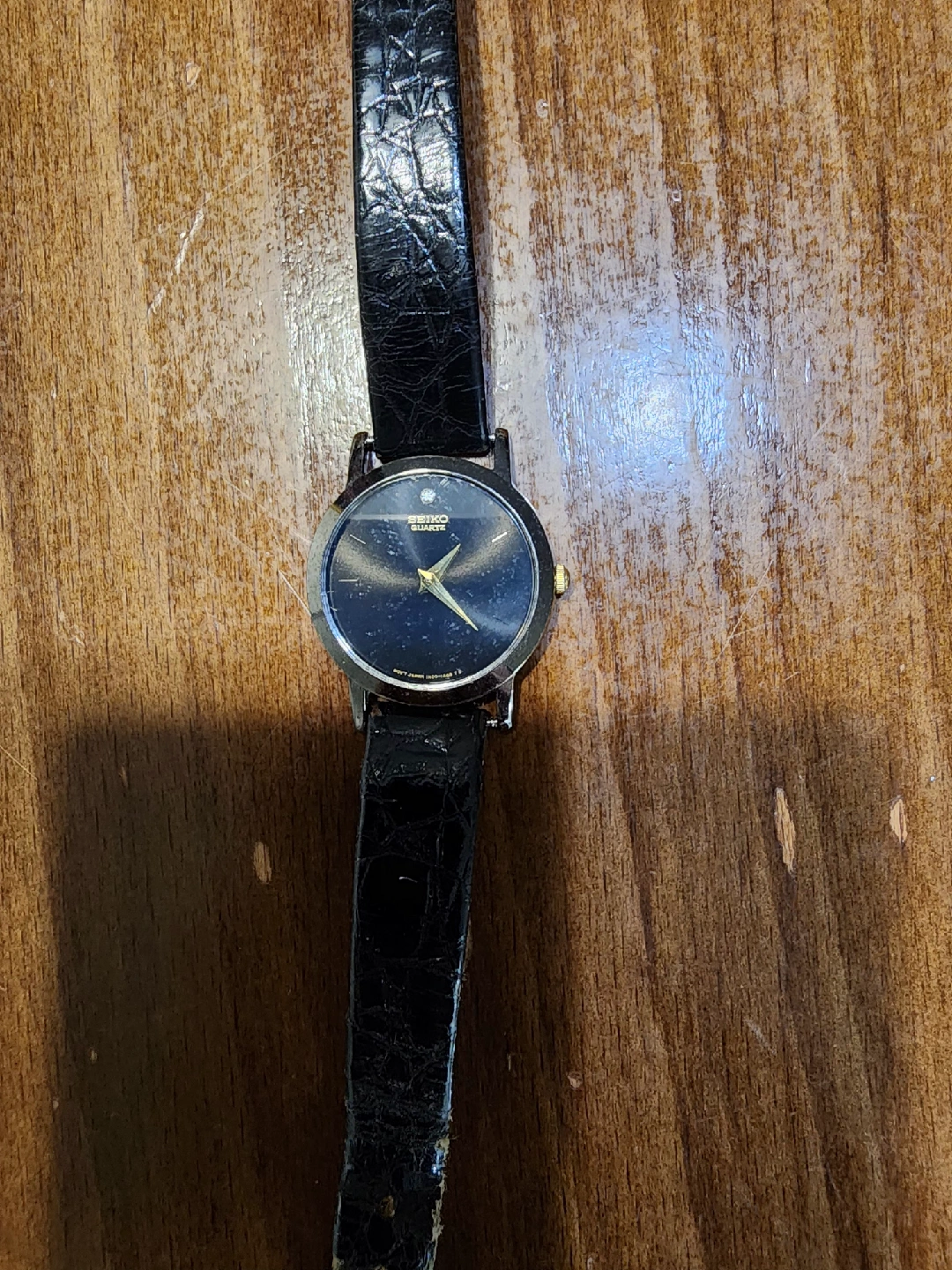 Selling a Seiko Quartz ladies watch with a black band and face. It's in used condition, as you can see from the photos. The band appears to be leather. Great for everyday wear! Need new battery