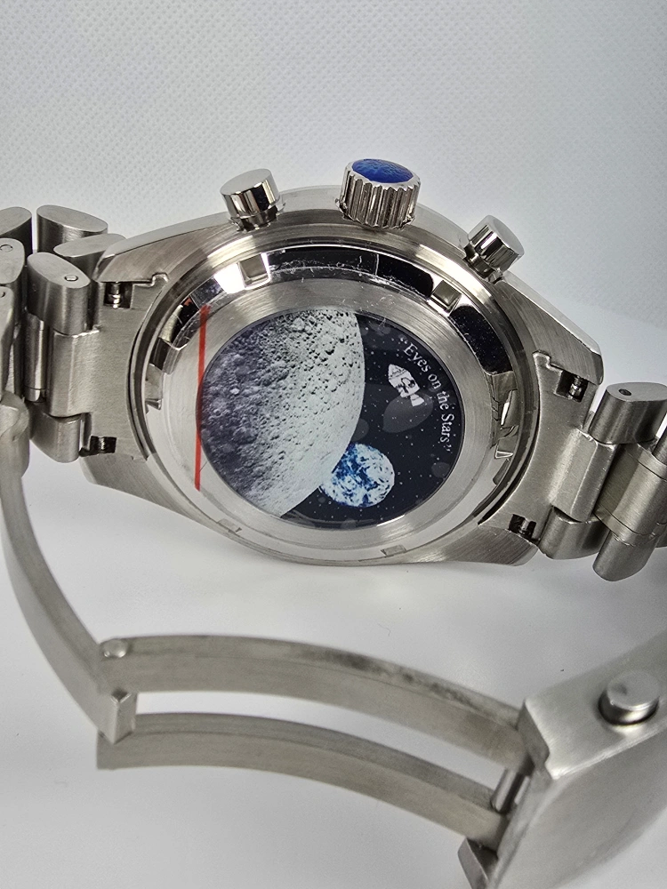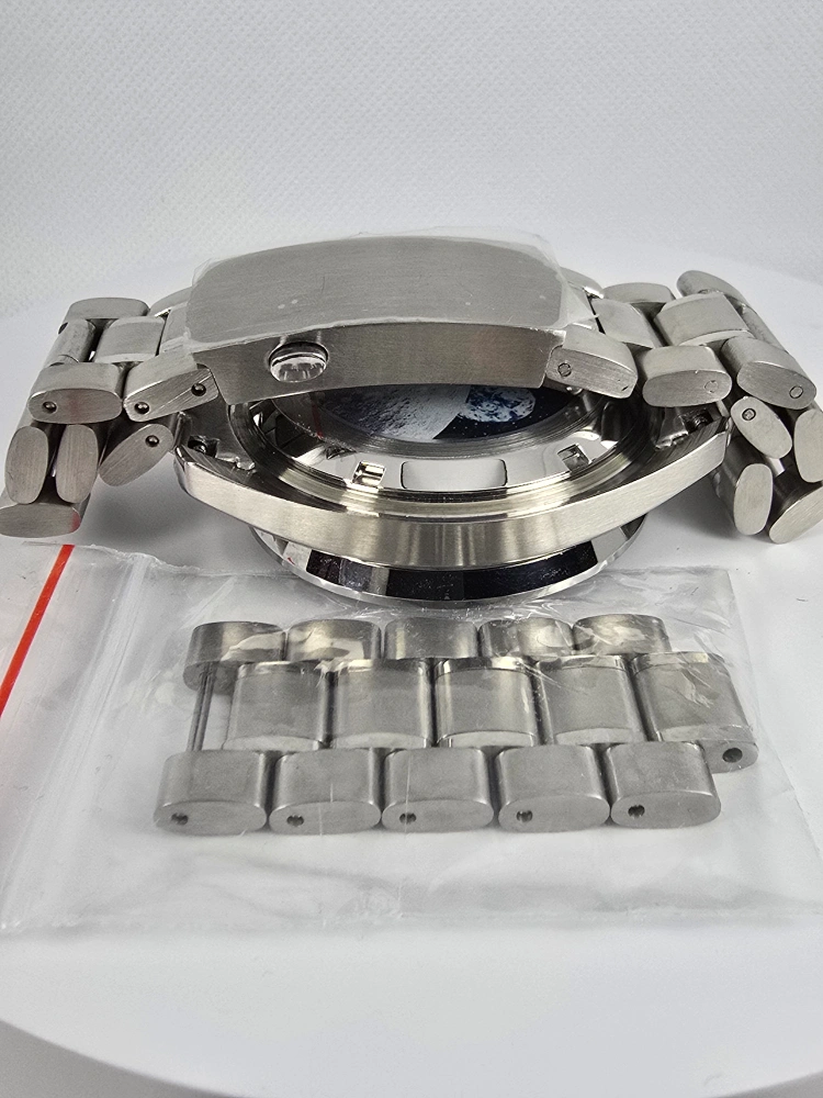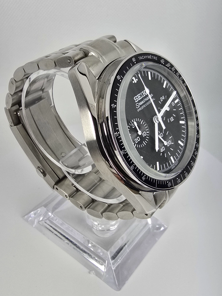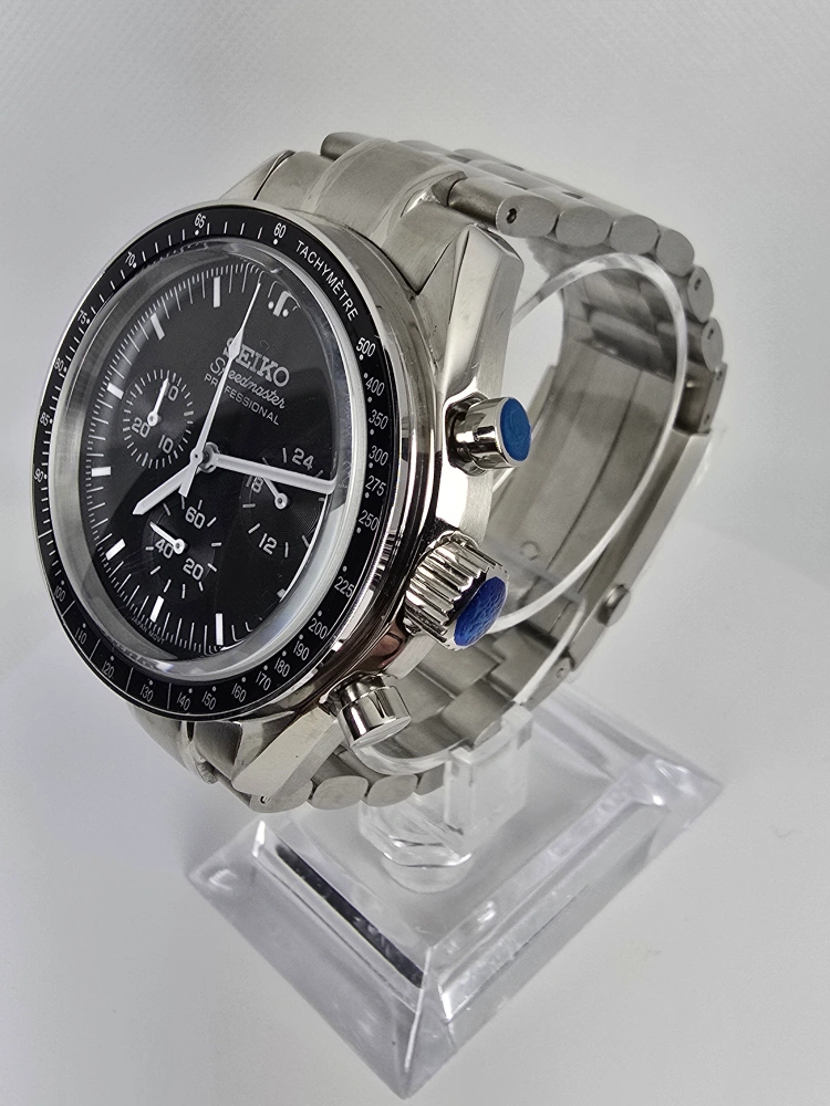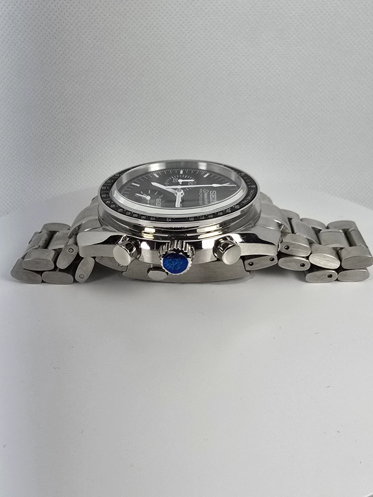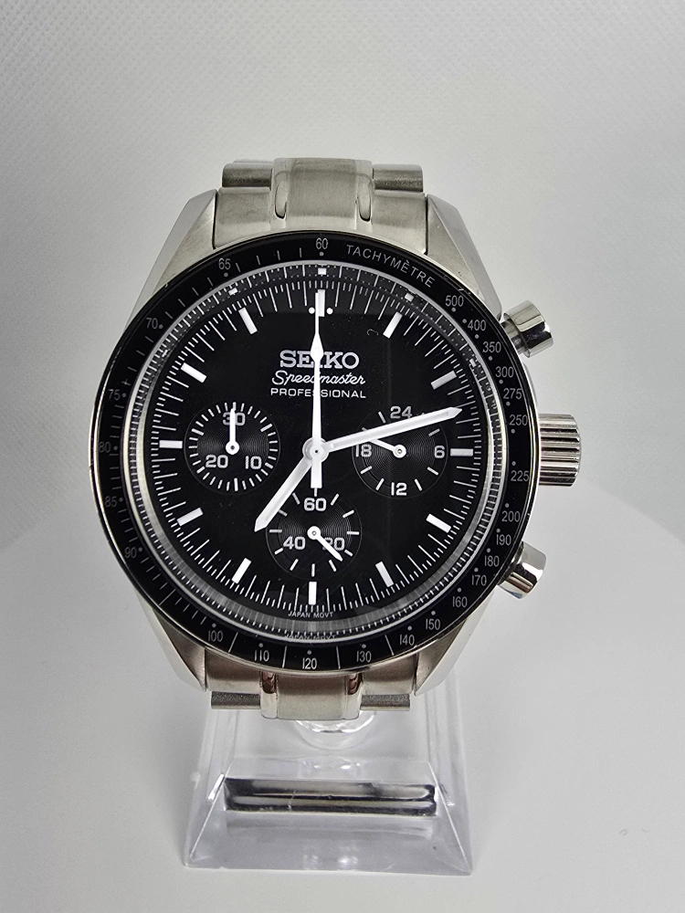 Seiko Mod – Moonwatch Speedko (Speedmaster Inspired) 💲 $350 CAD 📦 Shipping available across Canada (buyer pays shipping) This is a custom Seiko mod built with the reliable VK63 chrono-quartz movement (chronograph +24 hour subdial). It’s styled after the famous Speedmaster, giving you that luxury look without the luxury price tag. Details: • Chrono-quartz Seiko VK63 movement • Stainless steel case & bracelet • Black dial • Sapphire crystal • 24 hour subdial at 3 o’clock • Chronograph function • Steel screw caseback ✅ Runs great, keeps solid time, and has that sharp integrated-bracelet style that stands out on the wrist. 🔧 Custom Mods Available I also build Seiko mods by request — different dials, bezels, cases, you name it. • $100 deposit required • 2–3 week turnaround Message me if interested.
