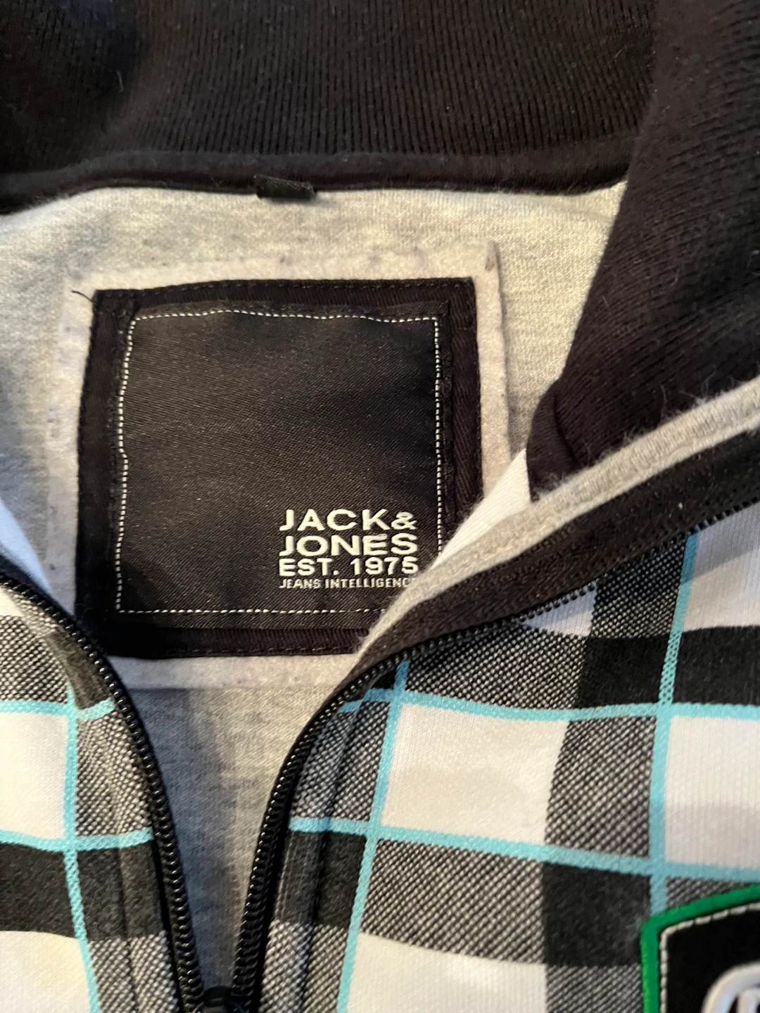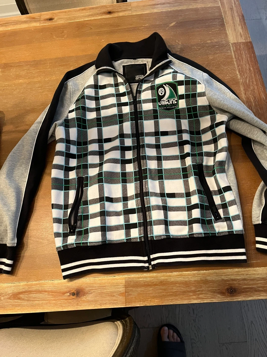 Selling a Jack & Jones jacket! It's a stylish jacket with a unique plaid design on the front and a solid grey back. Perfect for adding a bit of flair to your wardrobe