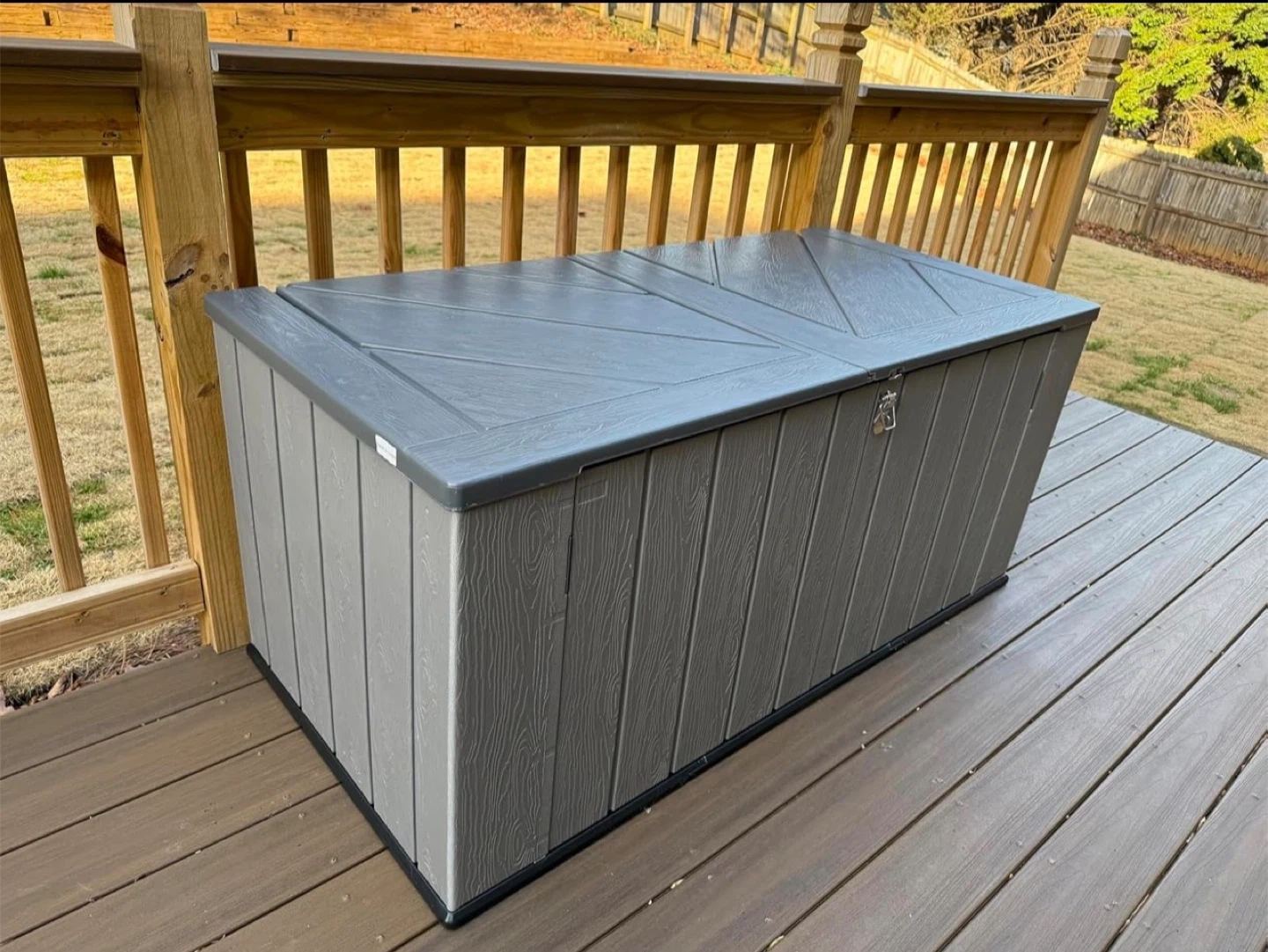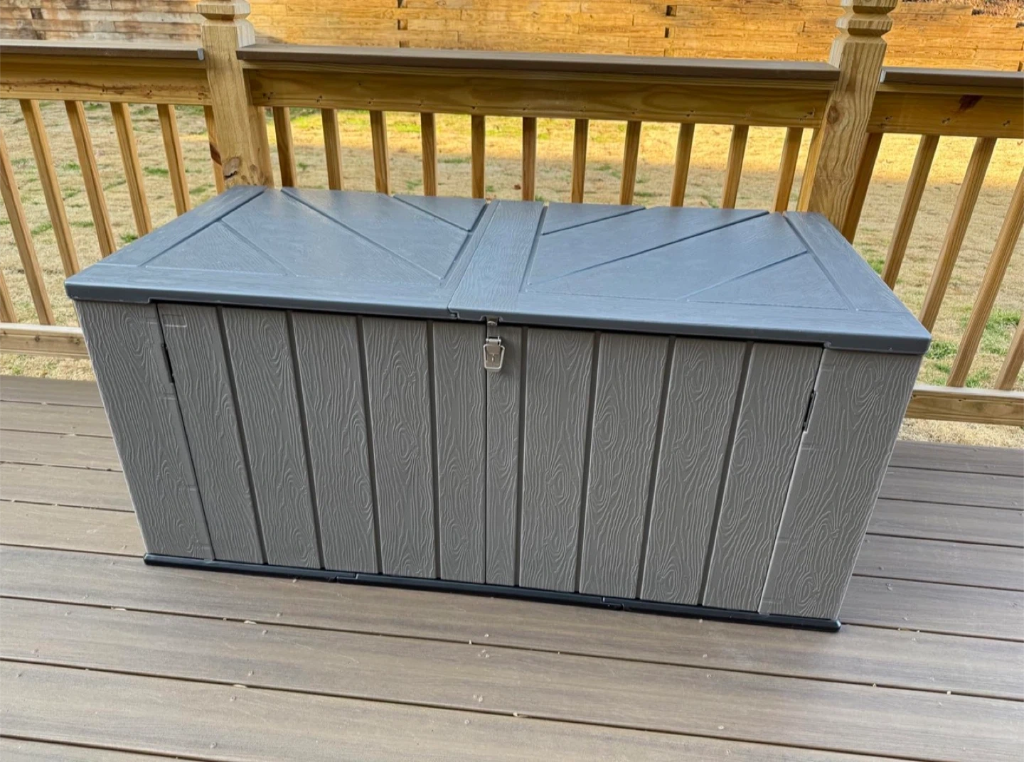 This is a gray outdoor storage deck box. It's made of durable plastic and has a hinged lid with a latch. It's perfect for storing cushions, garden tools, or toys outside!(This is my own use. I also have the same box that has not been installed yet. What is displayed is the finished box.)