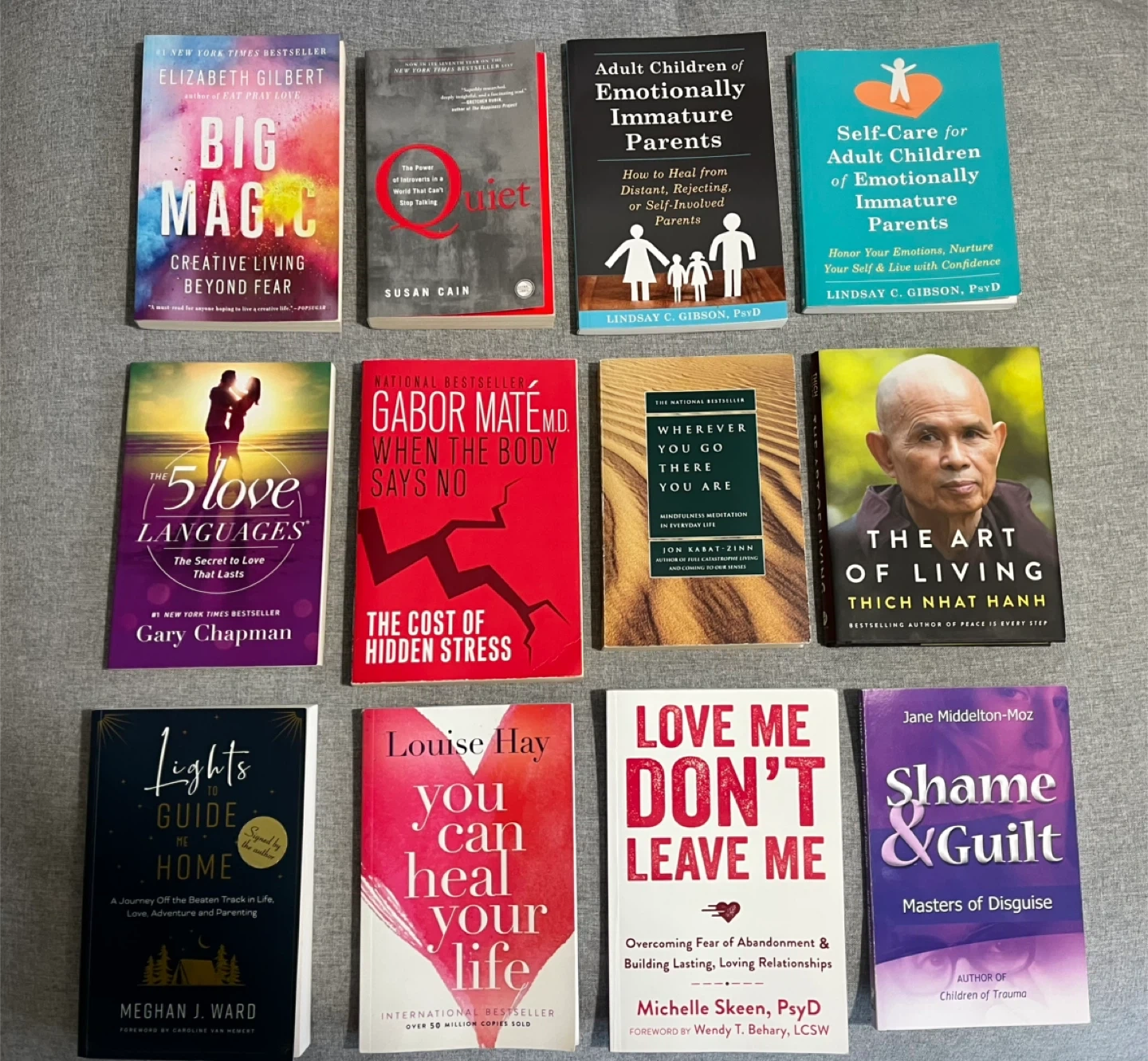 56Selling a collection of self-help books! Excellent/ new condition. Titles include: - Big Magic by Elizabeth Gilbert - Quiet by Susan Cain - The 5 Love Languages by Gary Chapman - When the Body Says No by Gabor Maté - Wherever You Go, There You Are by Jon Kabat-Zinn - The Art of Living by Thich Nhat Hanh - Lights to Guide Me Home by Meghan J. Ward - You Can Heal Your Life by Louise Hay - Love Me Don't Leave Me by Michelle Skeen - Shame & Guilt by Jane Middelton-Moz - Adult Children of Emotionally Immature Parents by Lindsay C. Gibson - Self-Care for Adult Children of Emotionally Immature Parents by Lindsay C. Gibson $10 for each or let’s agree on the price if you take multiple