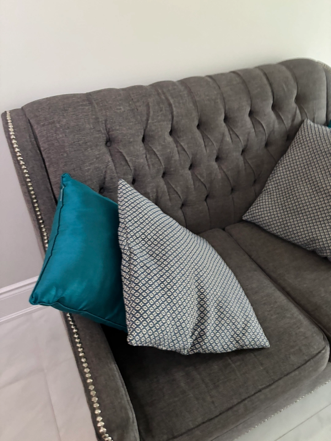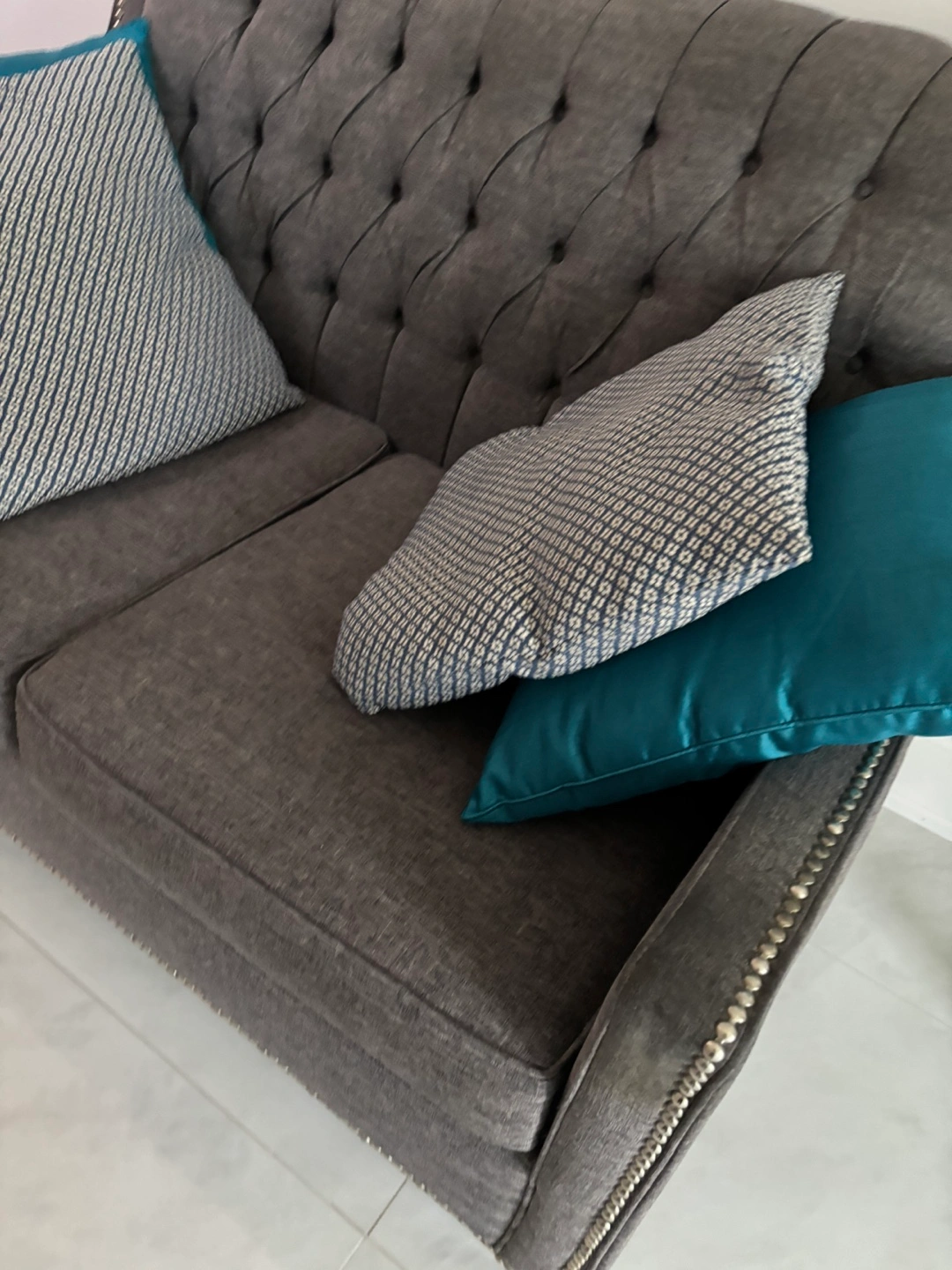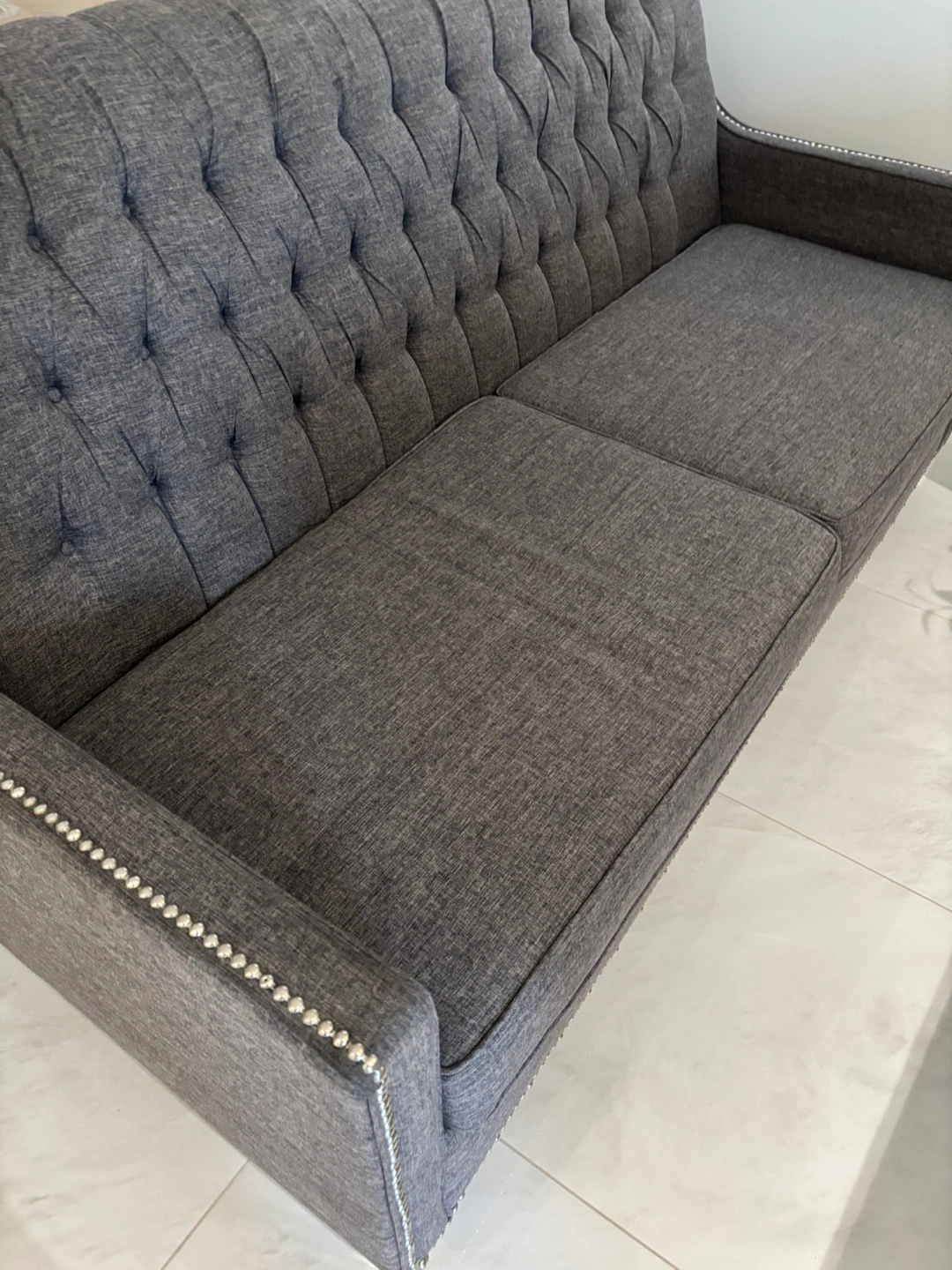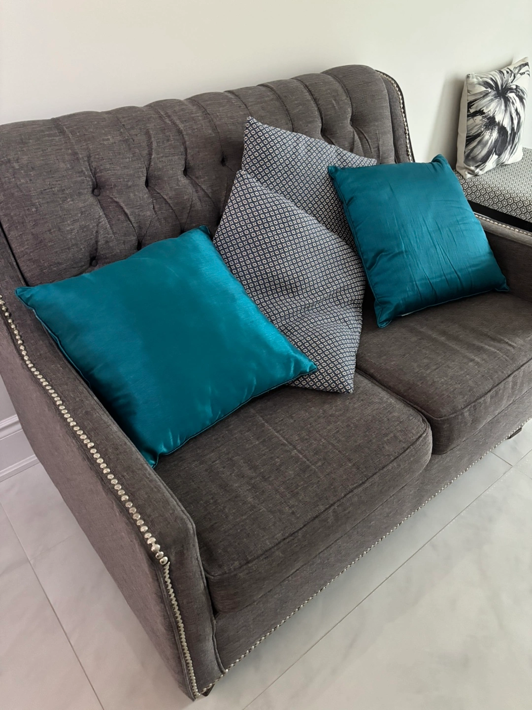 Two full sofas, coffeetable, sofatable, and area rug carpet