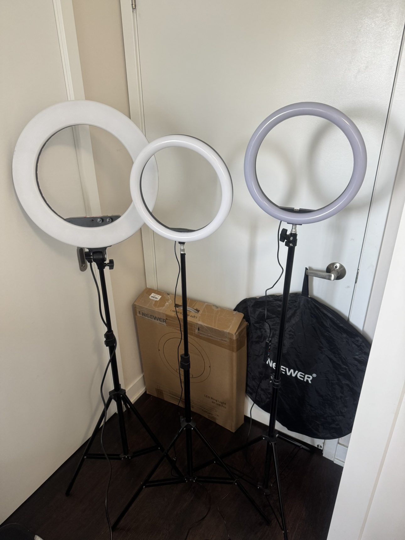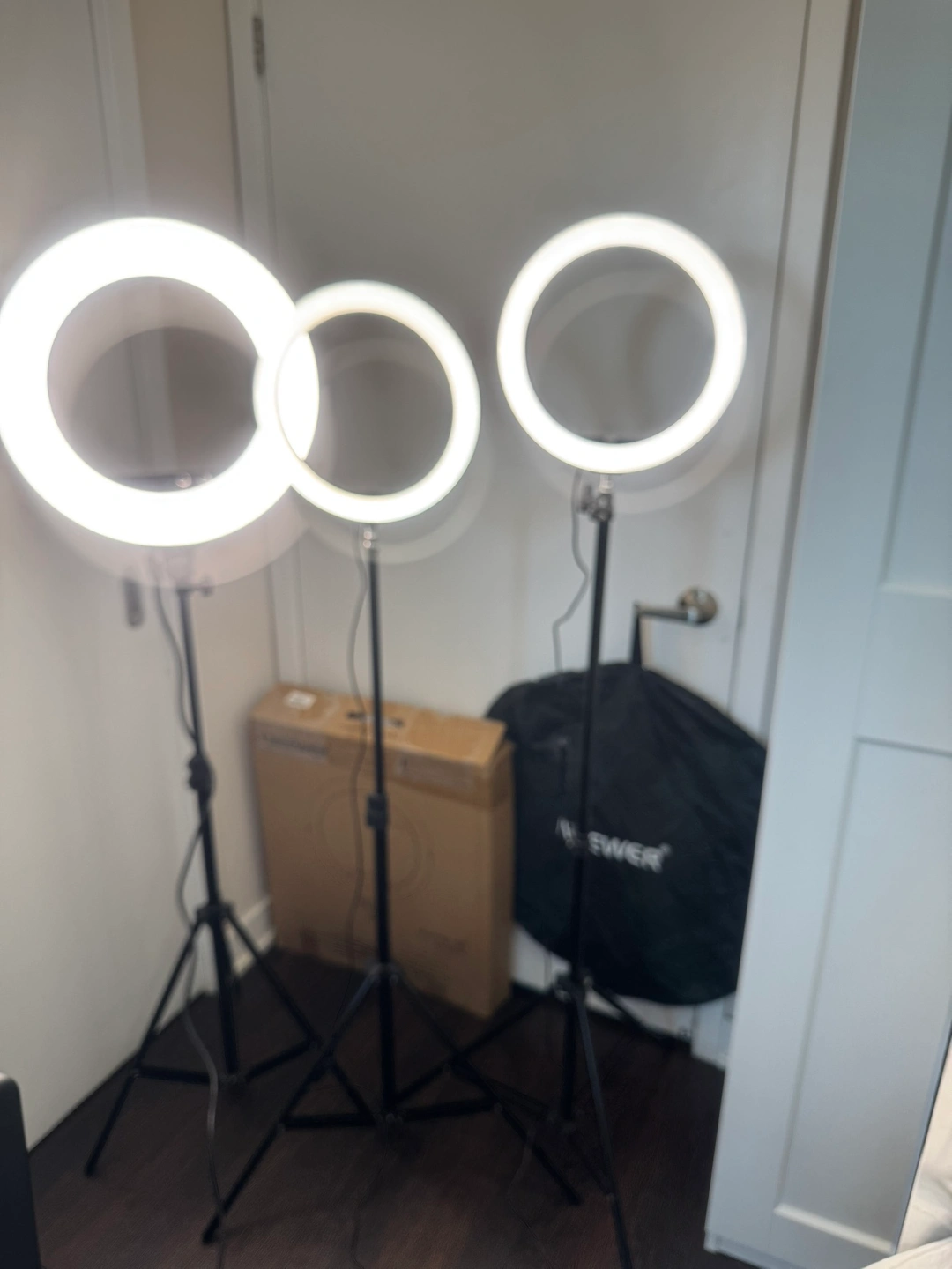 1000+Selling 3 Ring Lights, one is 18” the other two lights are both 12”. All 3 ring lights come with Stands, also includes the carrying case and Box, all in great condition, but one of them does have a piece of pink hello Kitty tape on it, it used to have a mirror, but I took the mirror off and it was a little sharp so I put a piece of tape there. Fabulous lights if you’re starting out, asking $65 for the lot, for everything together. Please see my other ads. Pick up in the lobby of my condo, located in Scarborough at Finch and McCowan