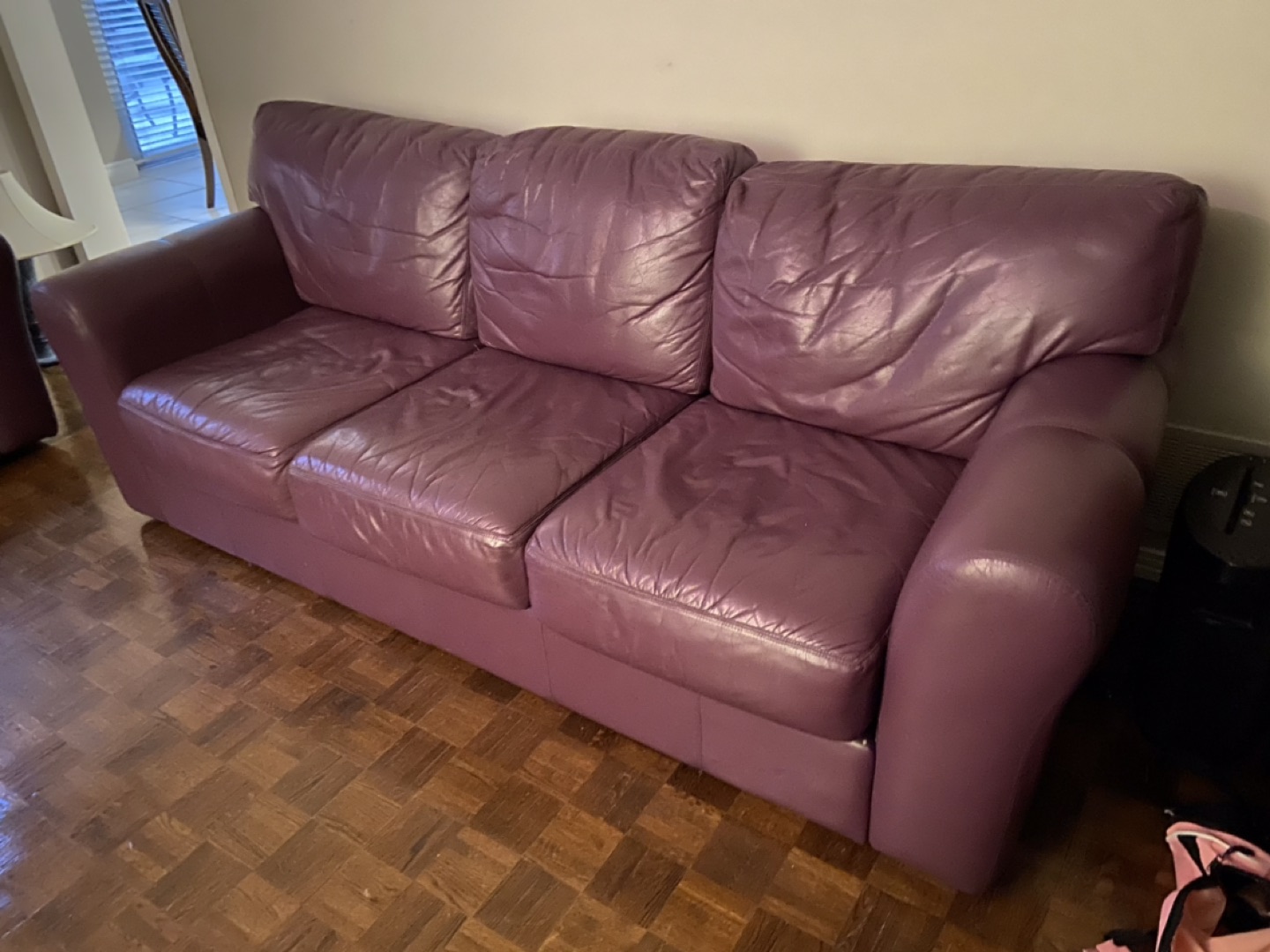 10They are in pristine condition. Buttery leather and so comfortable. Picture doesn’t do it justice. Dark purple, eggplant colour. Recently moved and we Purchased a pair of 3 seater all leather couches for my basement. Ceiling in my basement was too low to fit through. They are in my garage now. $400.00 for 1 ; $750.00 for pair