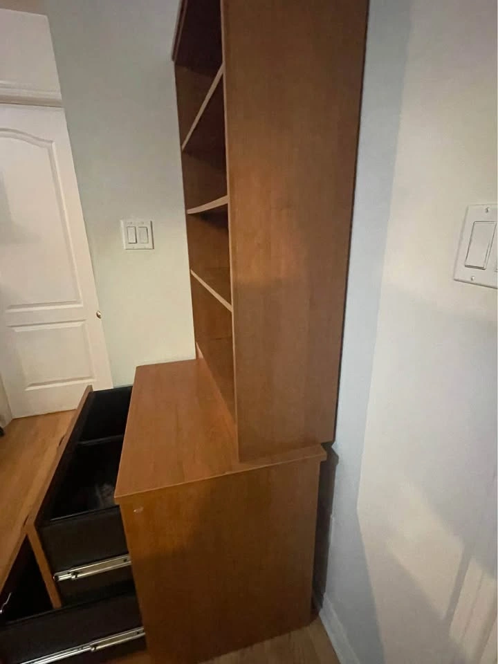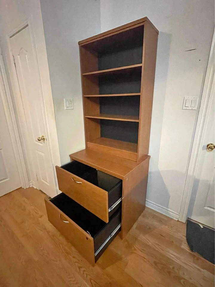 Selling together or separately. Together $100 separately $50 Dimensions: Bookshelf Height: 4 ft Length: 30 inches Width: 1 ft Storage Height: 29.5 inches Length: 30 inches Width: 22.5 Height together: 77.5 inches