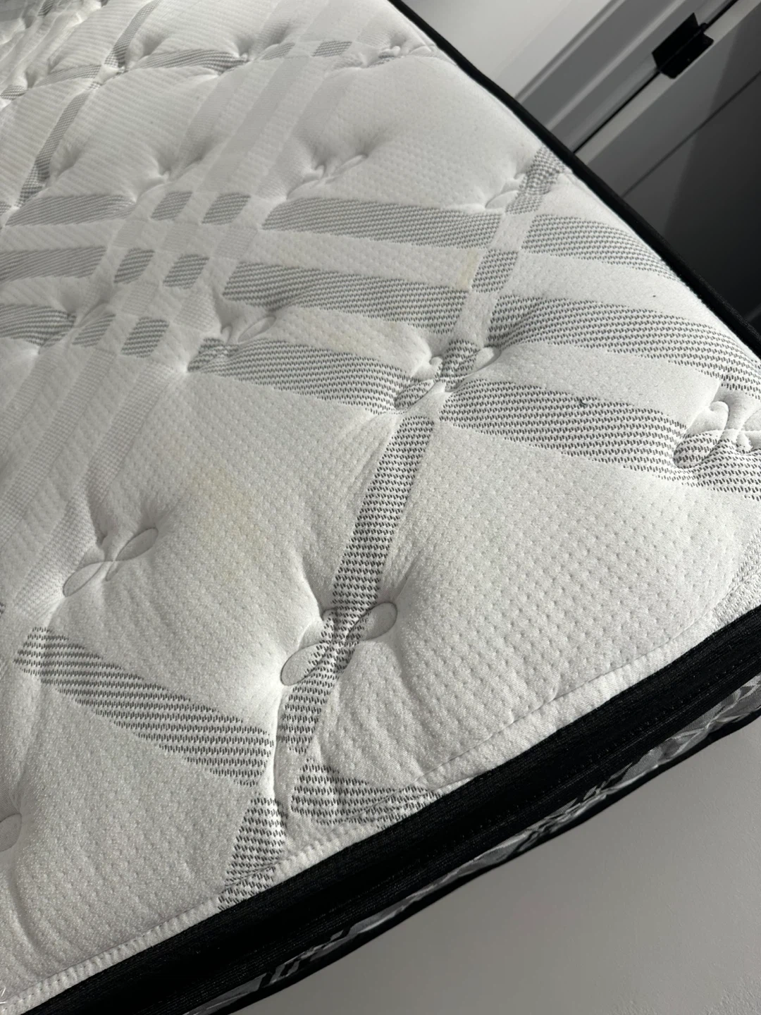 Leon’s brand , Queen size Comfortable pillow top mattress with a white and grey design. It features a quilted pattern for added softness. Great for replacing an old mattress!