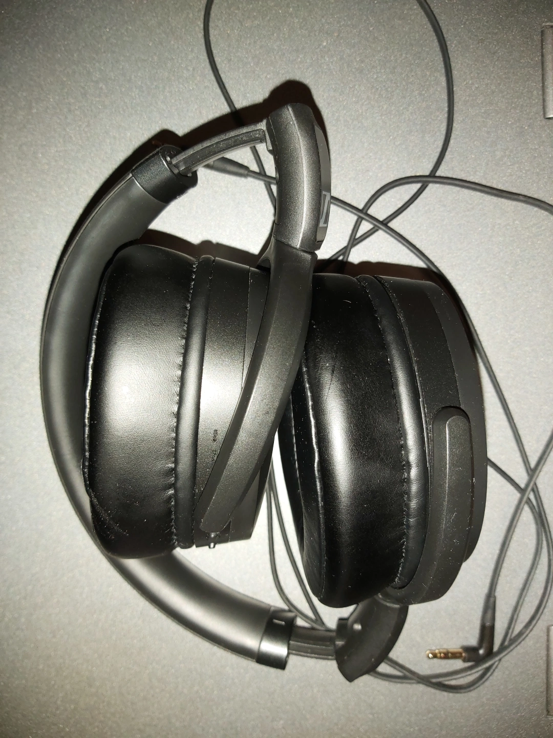 44Over-ear headphones. No rips or tears. 20+hr battery life. Includes charging and audio cables.