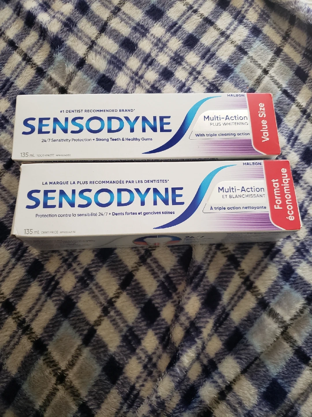 Selling two tubes of Sensodyne Multi-Action Plus Whitening toothpaste! These are 135ml tubes, perfect for 24/7 sensitivity protection and strong, healthy gums. They also offer triple cleaning action!