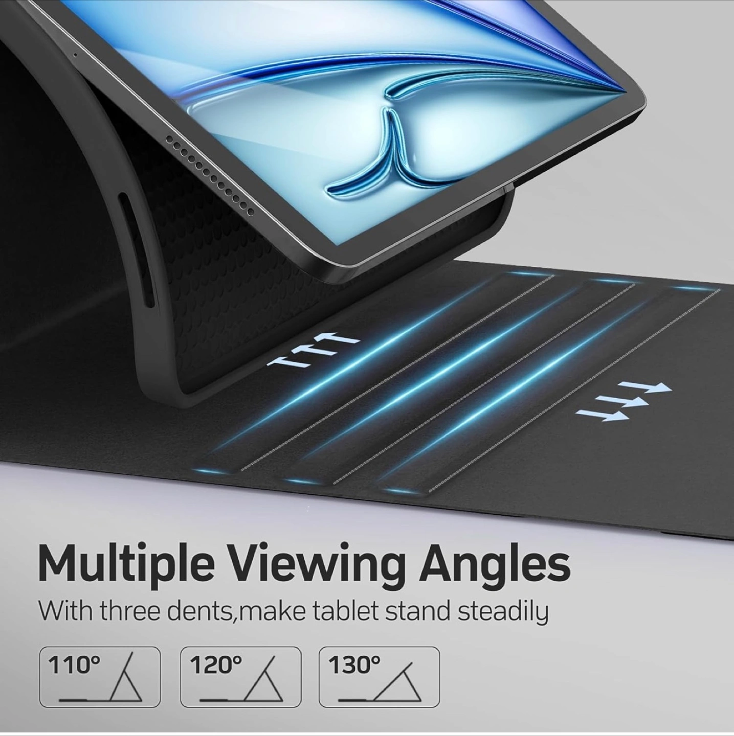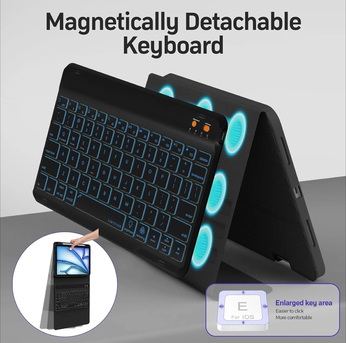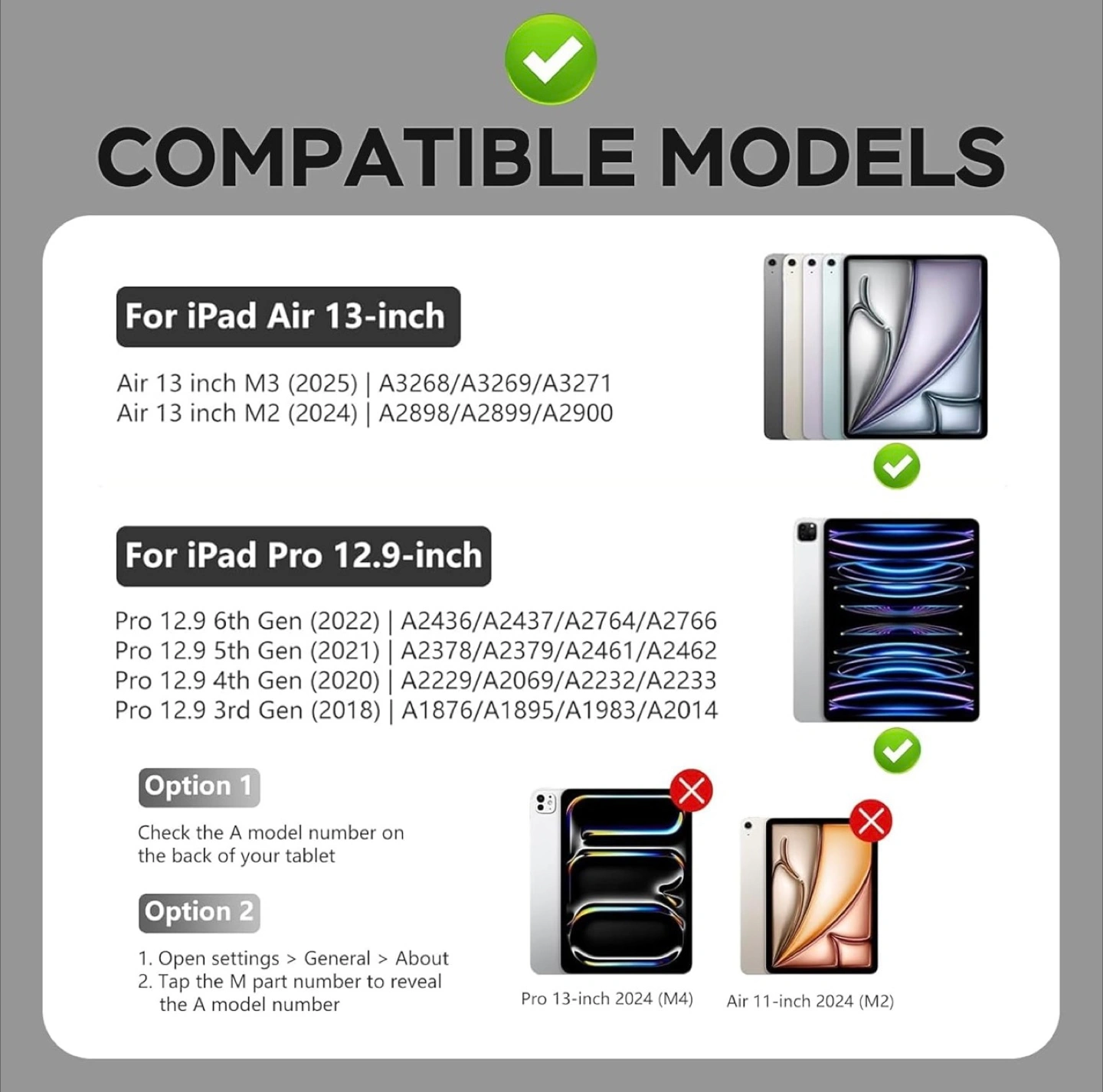 267Black detachable keyboard case. Compatible with iPad Pro 12.9-inch (5th, 6th Generation) and new iPad Air 13-inch (M2). Features a built-in pencil holder, auto sleep/wake function, and a fast Type-C charging port. Includes a full cover case.