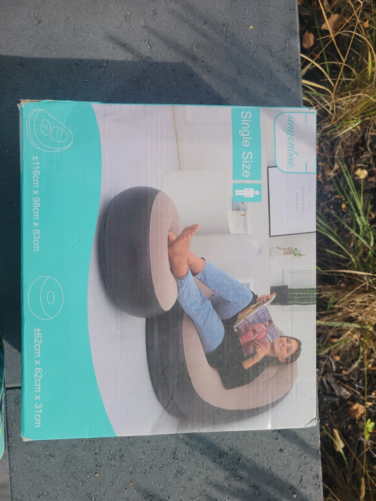Selling a brand new Senyoubao single size inflatable chair, still in its original box! It measures approximately 116cm x 98cm x 83cm when inflated, and the base is about 62cm x 62cm x 31cm. Perfect for adding a comfy and stylish touch to any room!