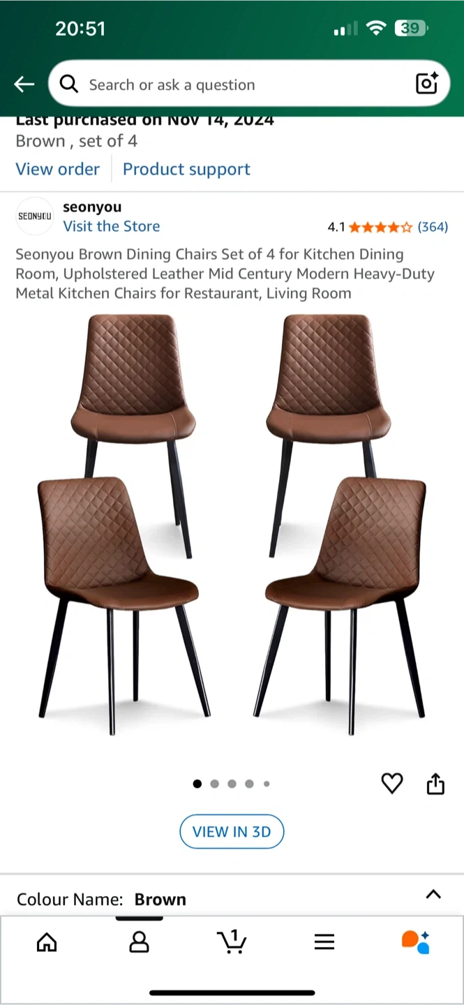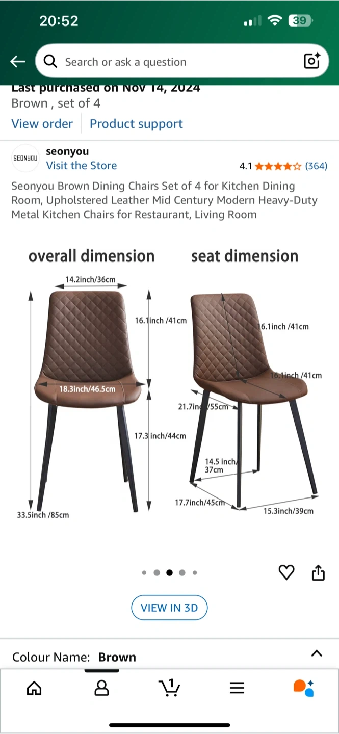 Selling a set of four Seonyou dining chairs in brown. These chairs feature an upholstered faux leather seat and back with a quilted design, supported by sturdy metal chair legs. They're perfect for adding a modern touch to your kitchen, dining room, or living room.