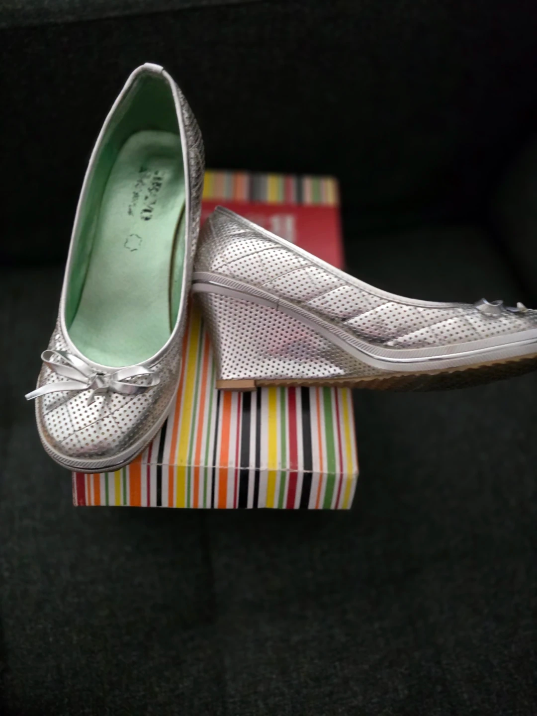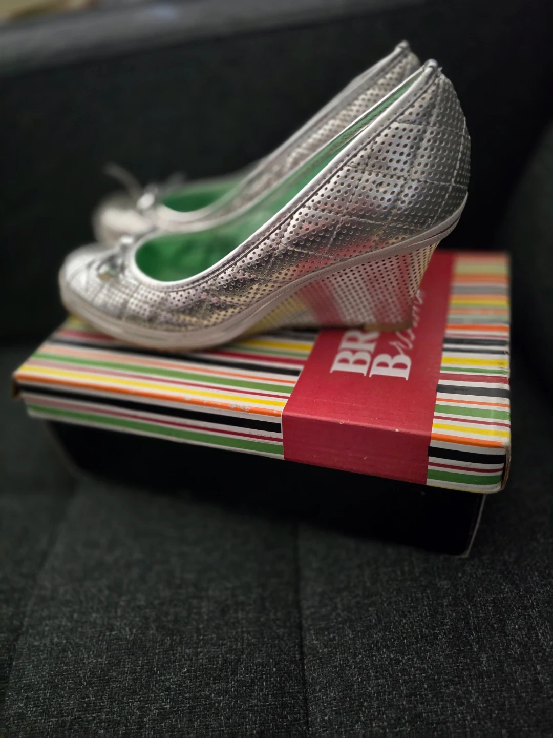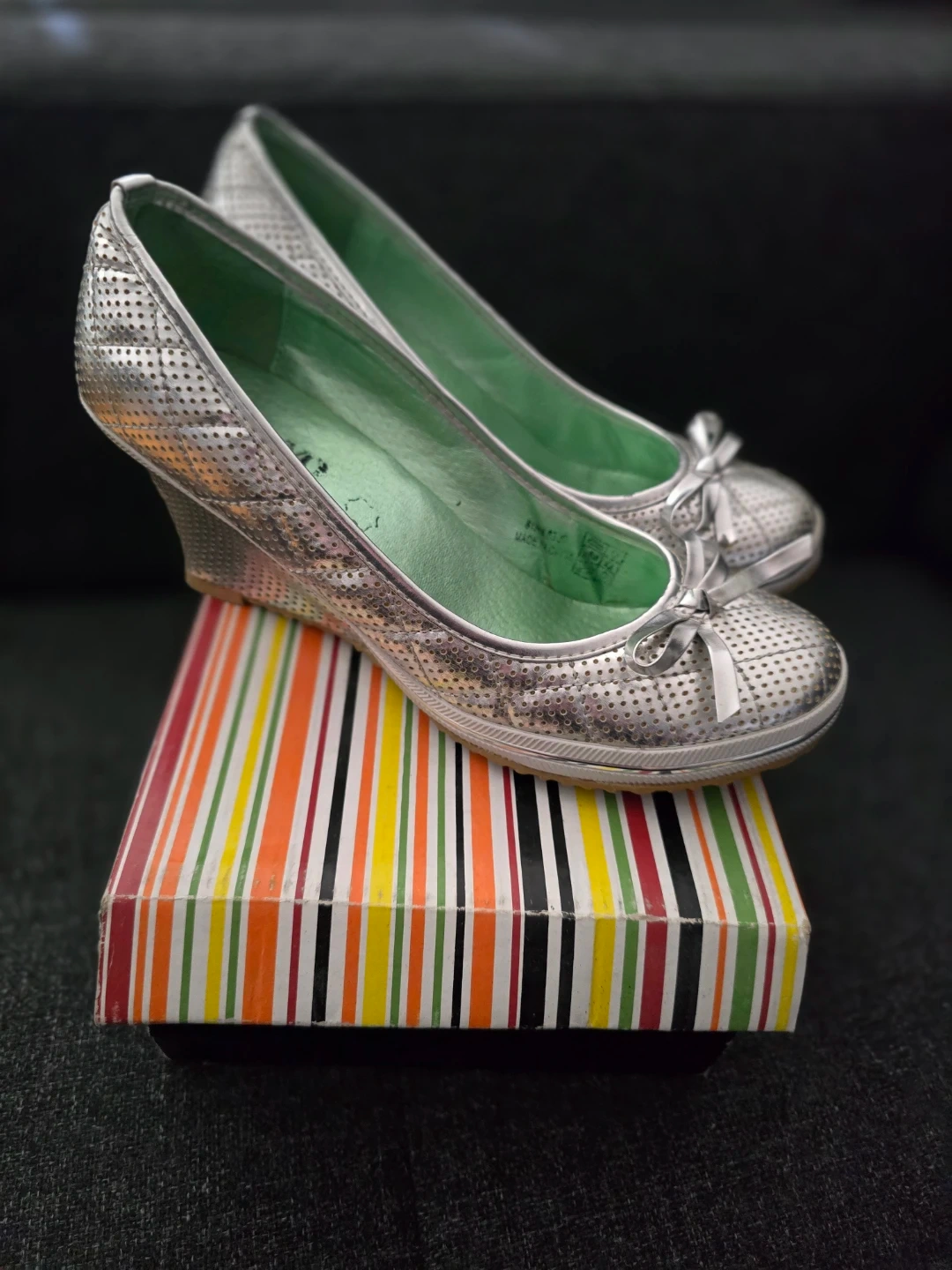 Bravo Woman wedge espadrilles in a shiny silver finish. Perforated design with a small bow detail on the toe. Includes original box.