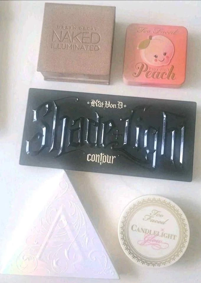 Bundle of high-end makeup must-haves! Perfect for collectors, makeup lovers or anyone looking to try out some cult-favorite products. All items are authentic, purchased from Sephora! Too Faced Candlelight Glow (Warm Glow) – Highlighting Powder Duo (0.35 oz / 10 g) Urban Decay Naked Illuminated (Luminous) – Shimmering Powder for Face & Body (0.2 oz / 6 g) Too Faced Papa Don’t Peach – Peach-Infused Blush (0.32 oz / 9 g) Kat Von D Shade + Light Contour Palette – 6-pan face contour palette (Refillable, preowned) Kat Von D Alchemist Holographic Palette – 4-shade Face & Eye Highlighter palette (0.05 oz / 1.53 g each) 💄 Condition: Preowned – Some pans may show usage. Packaging may show wear (scratches/scuffs). Please see all photos for exact condition. 🎨 Highlights: Variety of face products: highlighters, blush, contour, shimmer Full-size products from popular discontinued/limited lines Great for experimenting with different looks or expanding your collection 📦 Lot is sold as-is. No returns due to the nature of cosmetics.