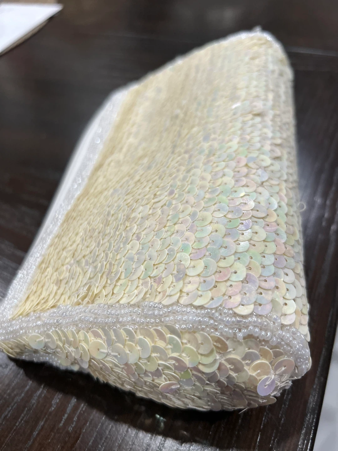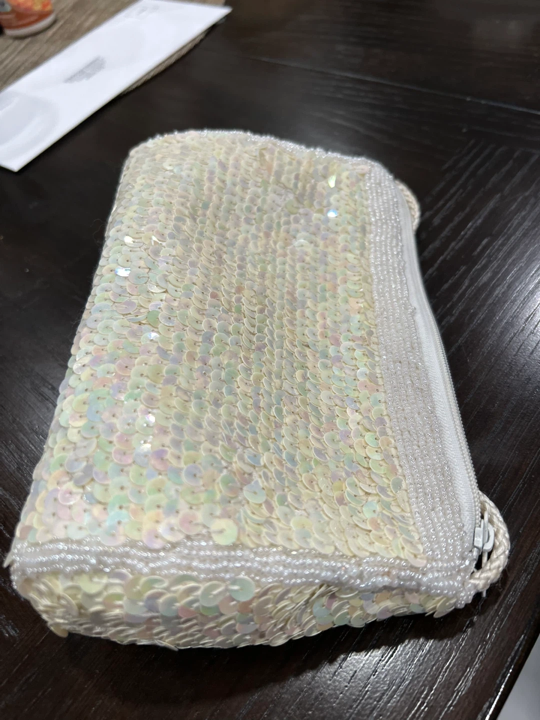 This is a lovely sequin beaded clutch bag, perfect for evenings out or special occasions! It's in great condition and has a zipper closure to keep your belongings safe. The inside is lined with a white fabric, and there's a delicate strap inside if you want to use it as a wristlet