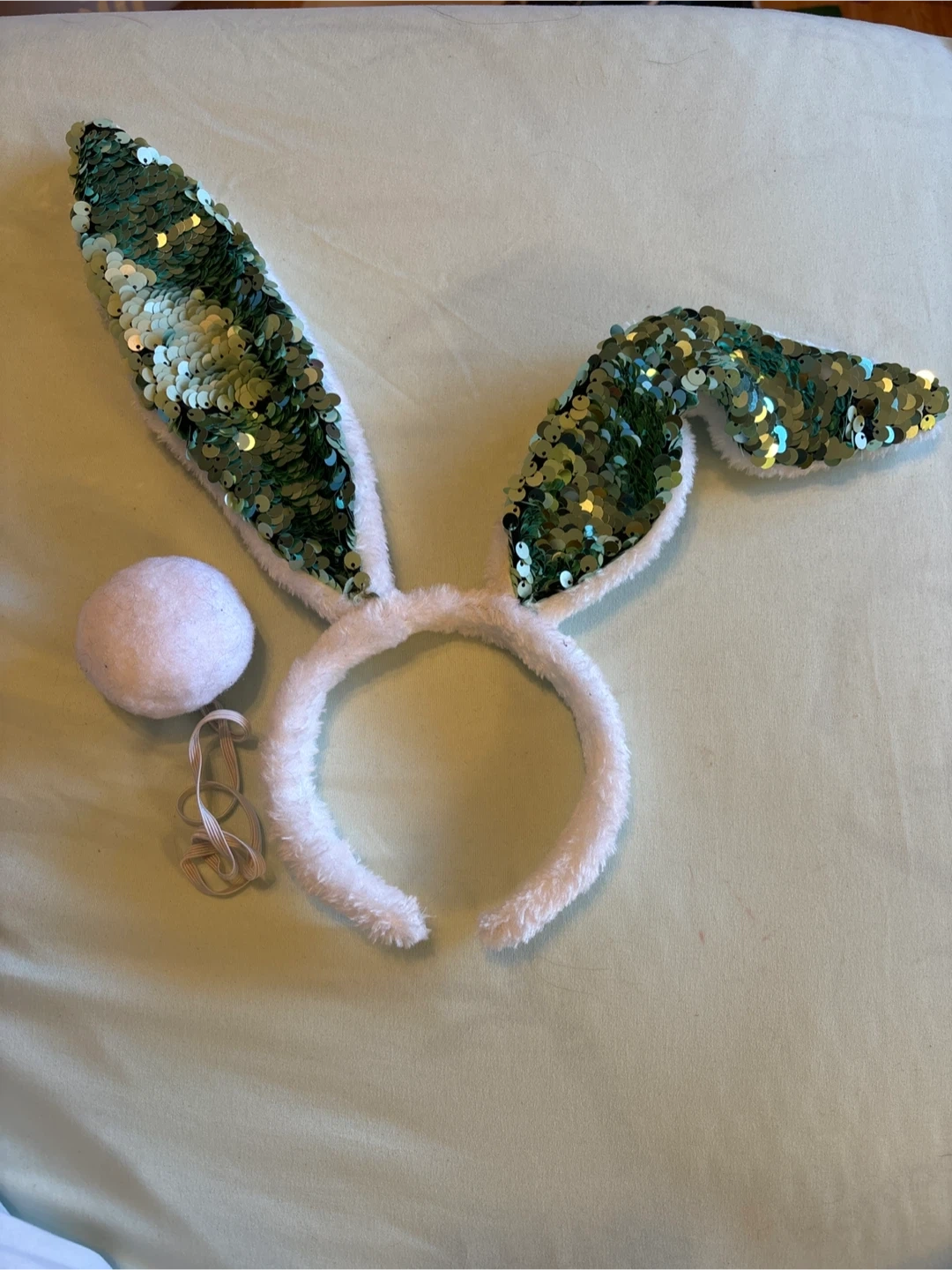 Cute bunny ears headband with green sequins and a fluffy white tail! Perfect for a costume or just for fun. The headband is soft and comfortable to wear