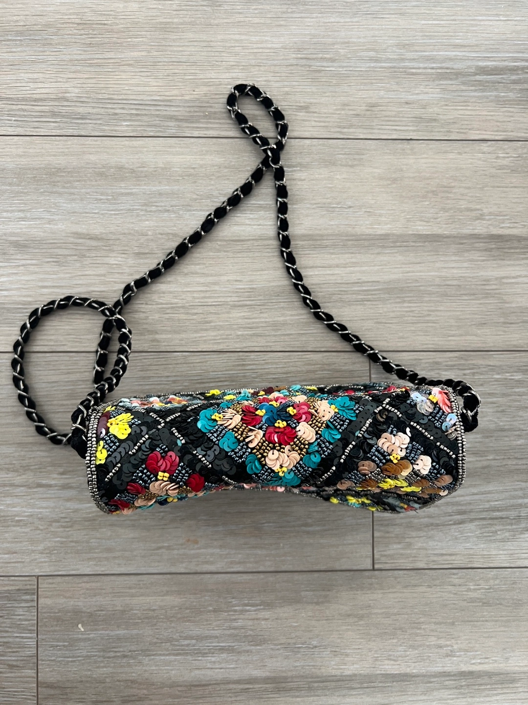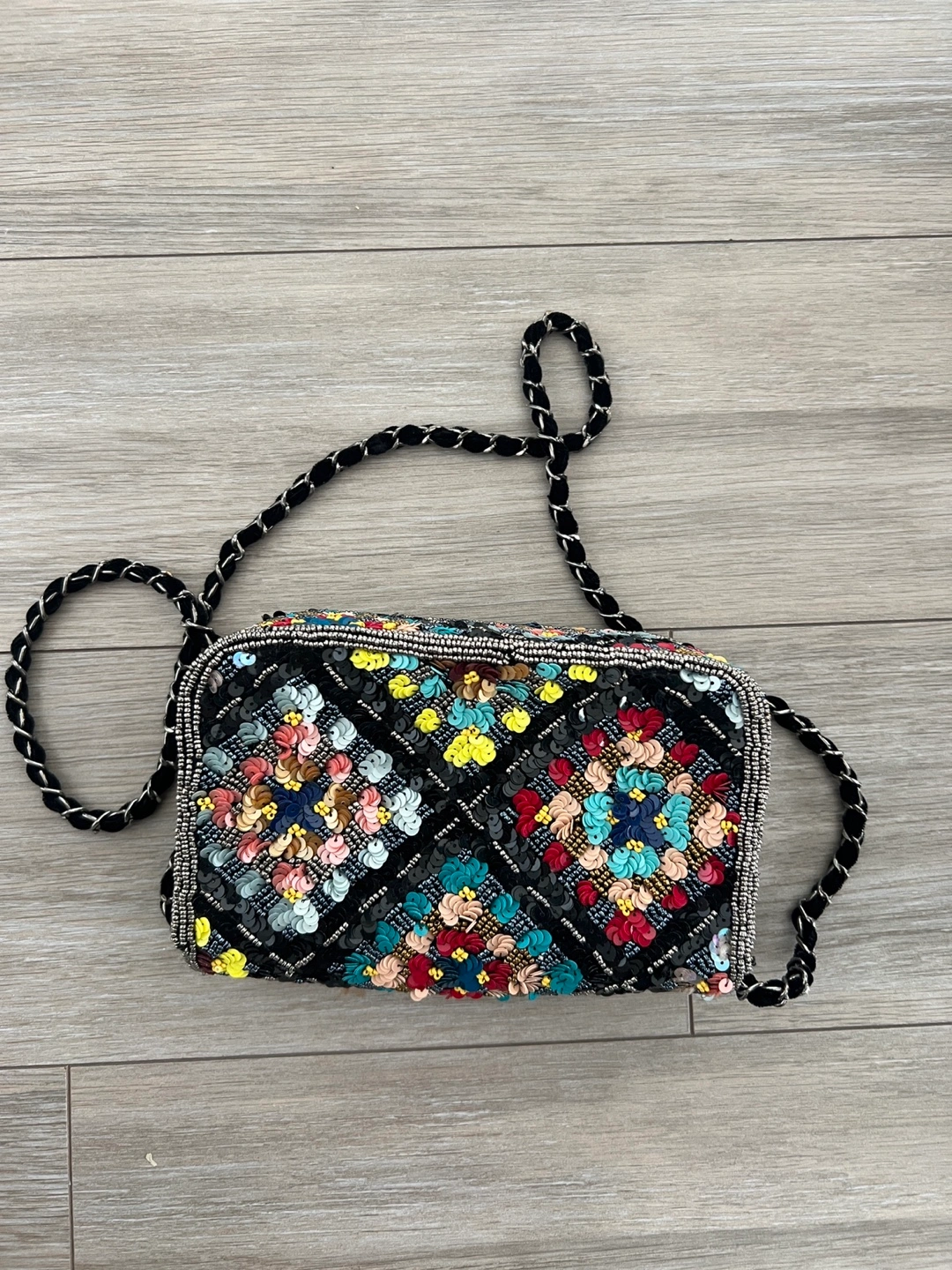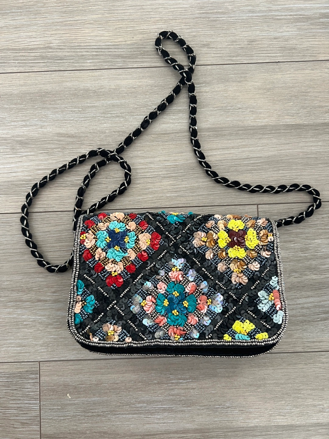This shoulder bag features a unique design with sequins and a black chain strap. The bag is in great condition and ready for a new owner! It's perfect for adding a touch of sparkle to any outfit