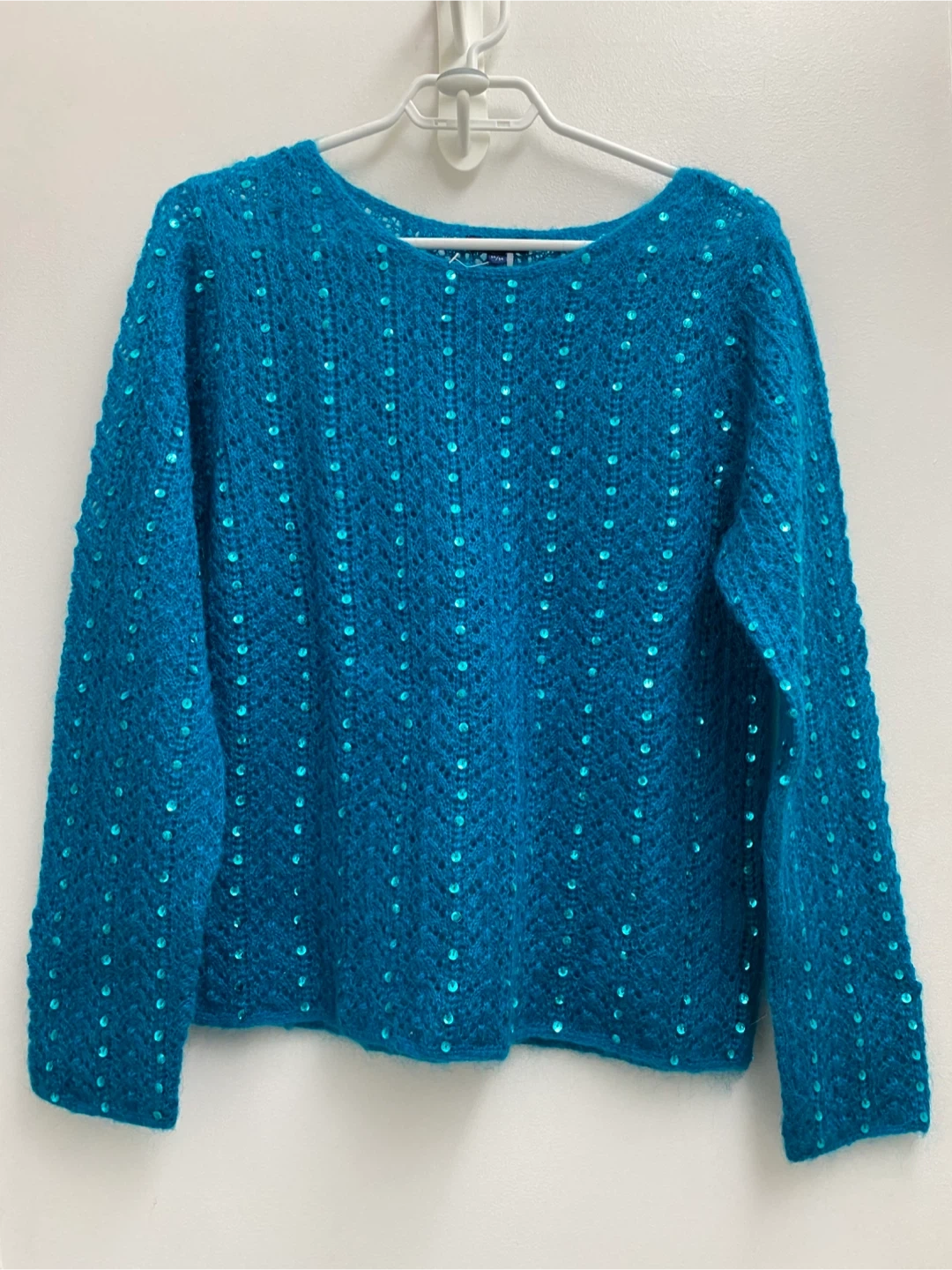 214Snuggle up in this beautiful teal sweater from RW&CO.! It's a lovely knit with sparkling sequins, perfect for adding a touch of glam to your day. In very good condition, worn once. Hwy427/Dundas.