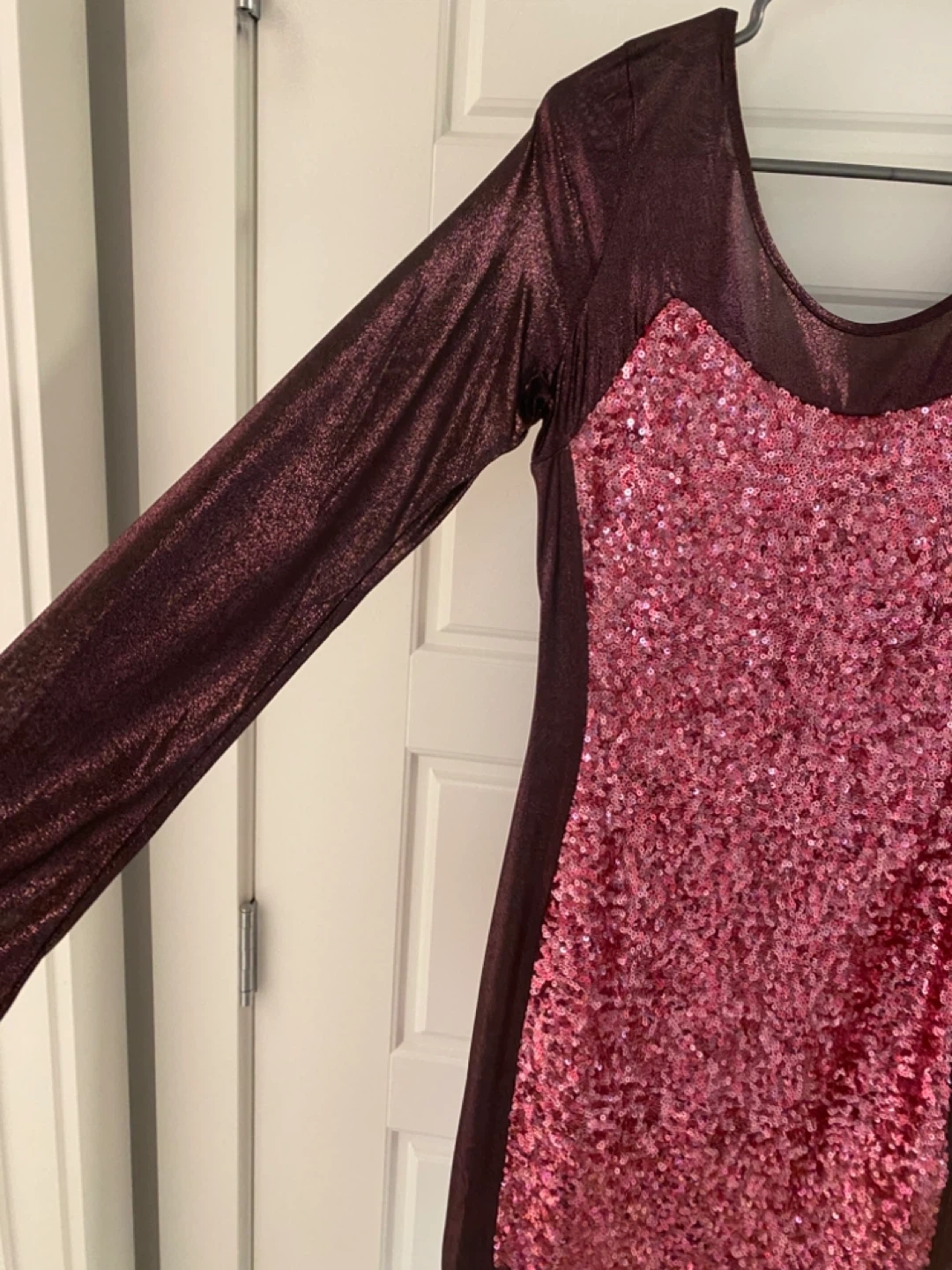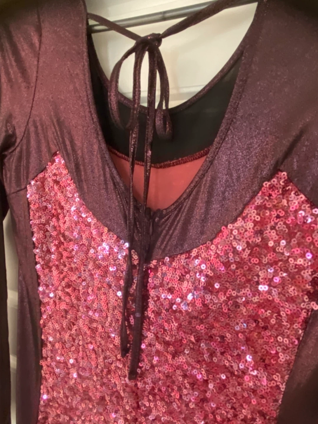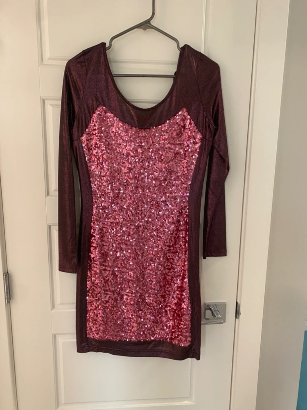 Worn once , some stretch -Selling a fun and sparkly party dress! It features a burgundy body with a pink sequin panel. The dress has long sleeves and a tie back. Perfect for a night out! Handwash