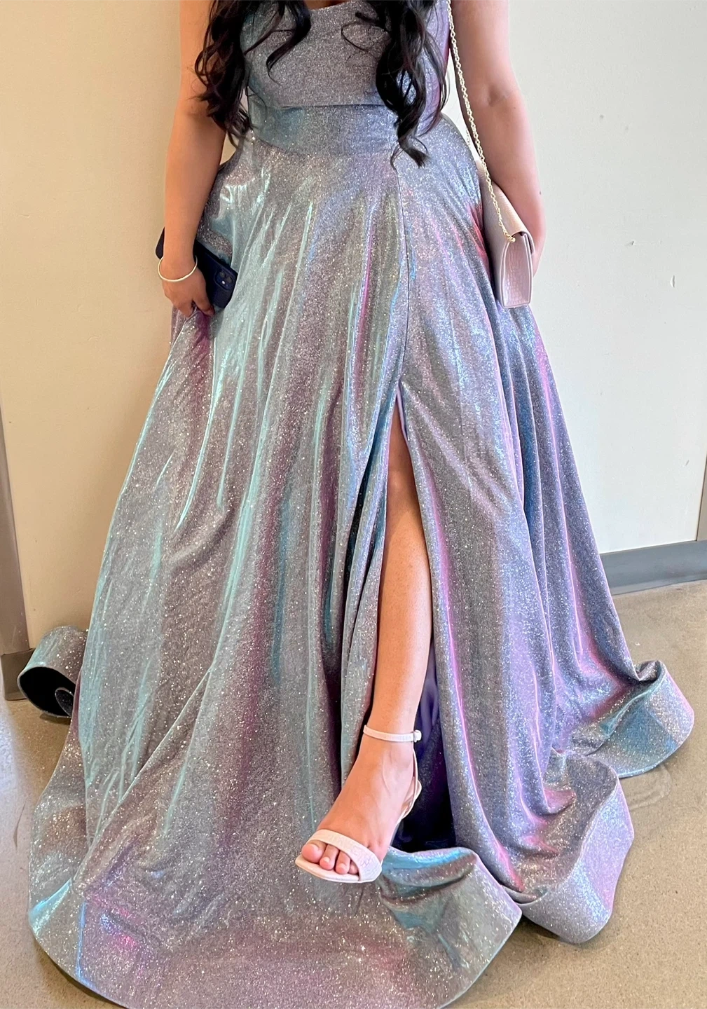 10Beautiful sequin dress, perfect for prom or a special occasion! It features a flattering silhouette and a stylish slit. The dress has a stunning shimmer that catches the light. It's in great condition and ready to make someone feel amazing!