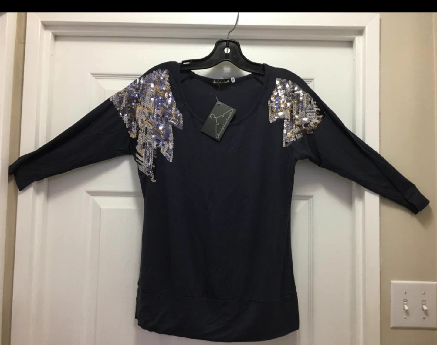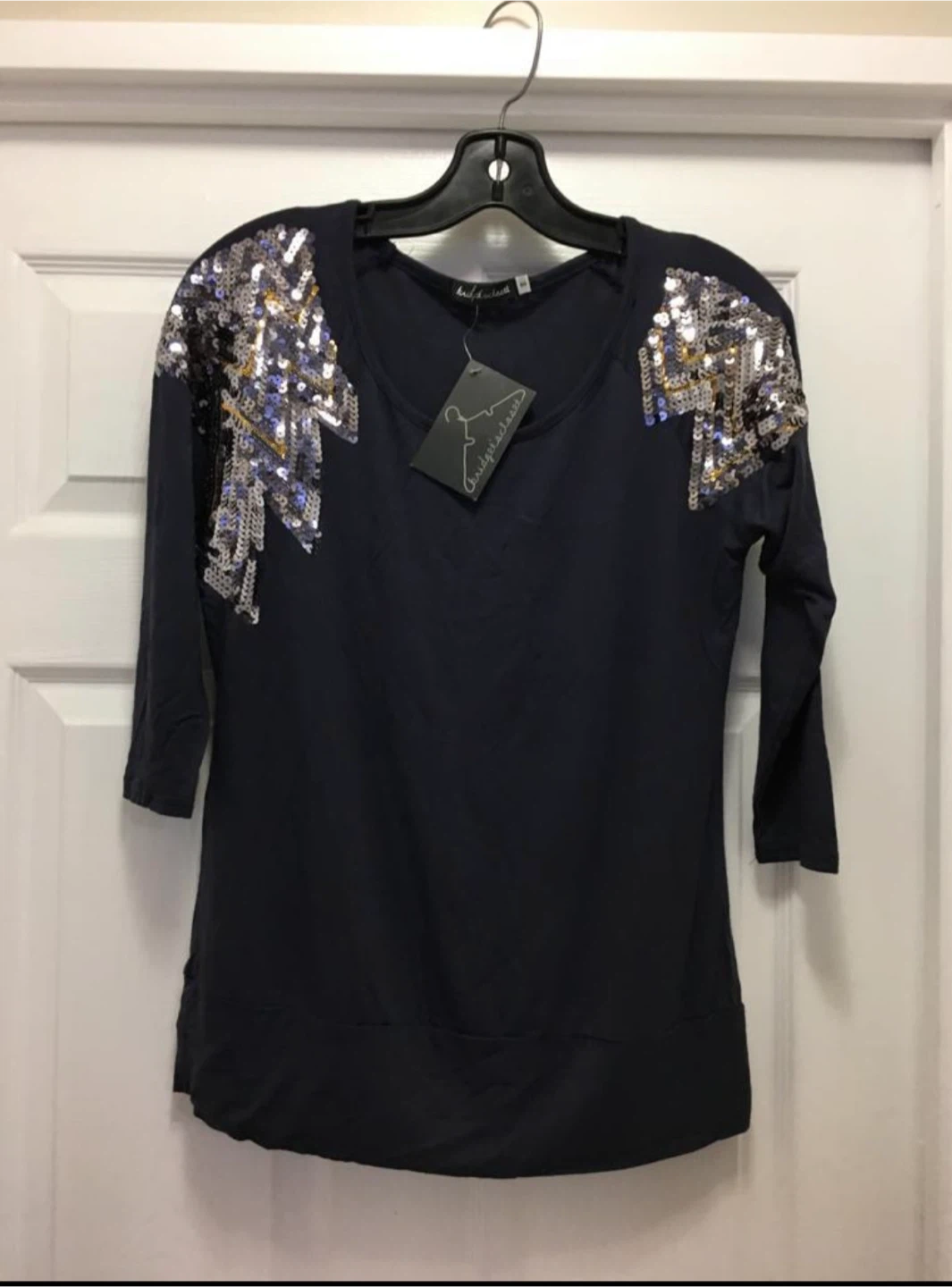 181Here's a blue top with sequin detailing on the shoulders! It's a stylish way to add some sparkle to your outfit. Perfect for a night out or just to dress up a casual look