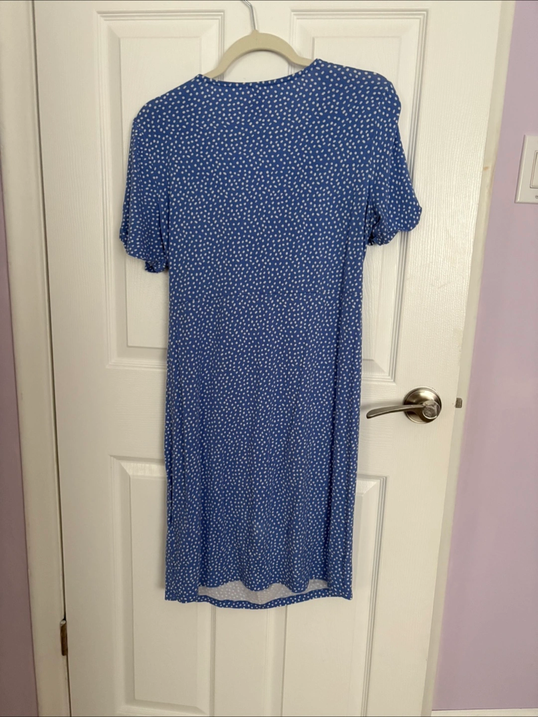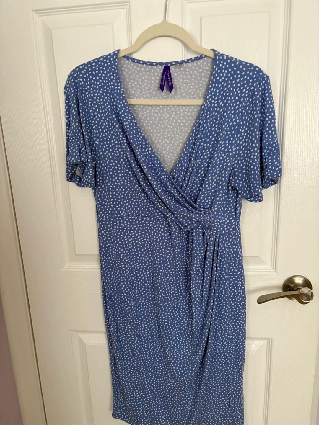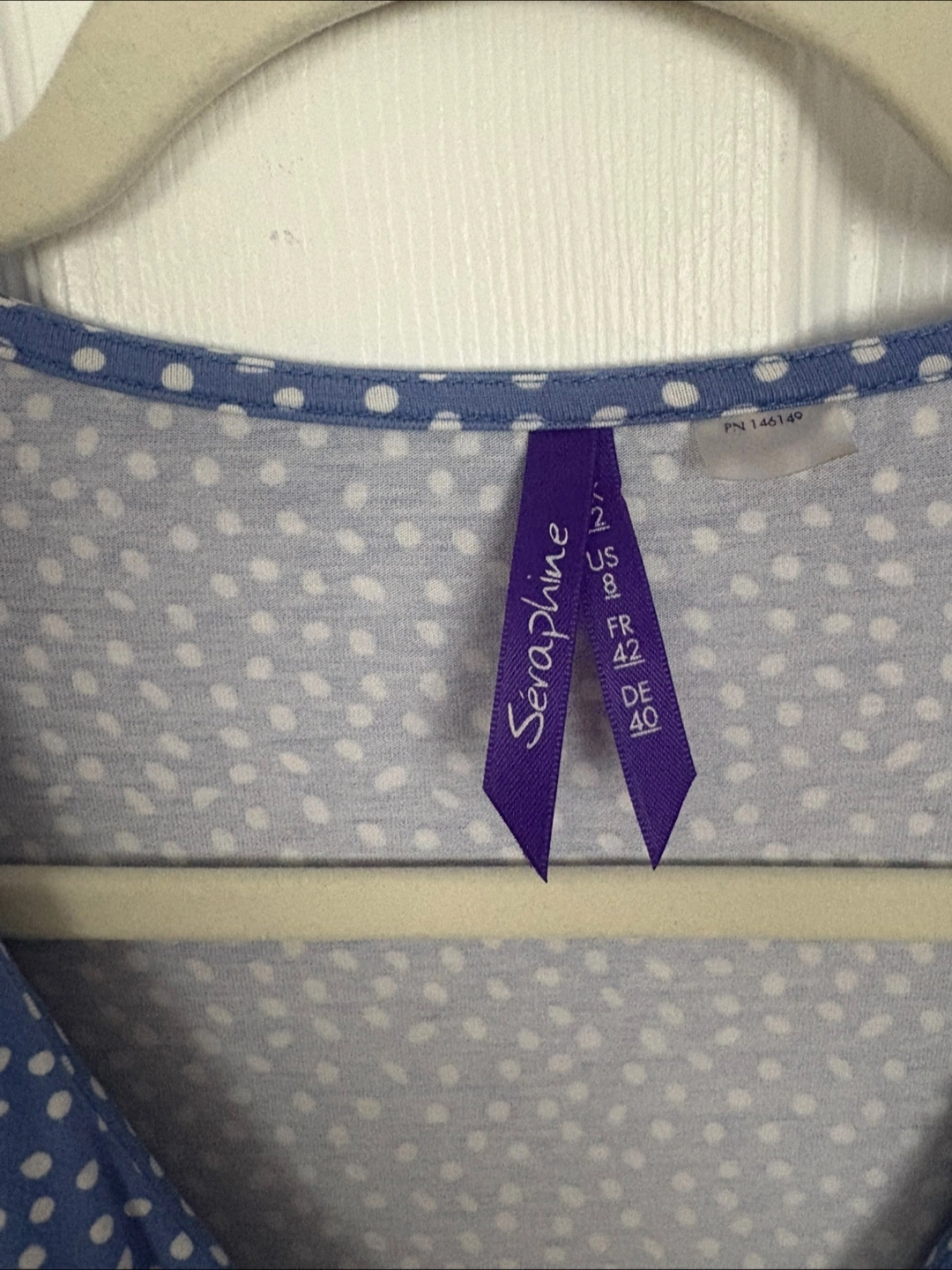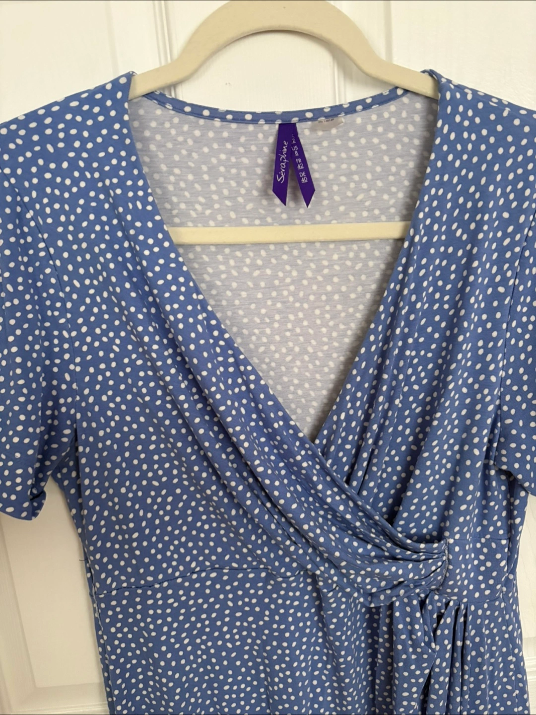 10This is a Seraphine maternity dress in a lovely blue with white polka dots. It's a size 8. Has been modified and no longer has tie at front