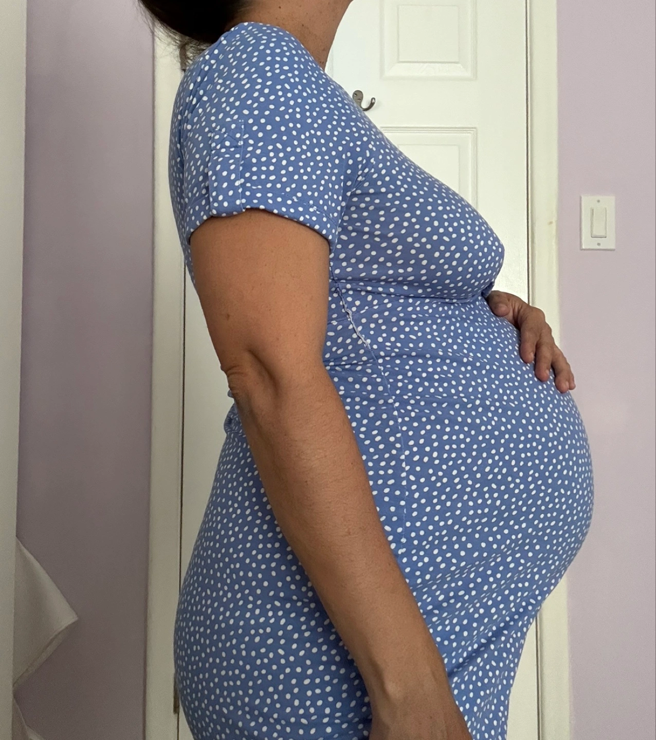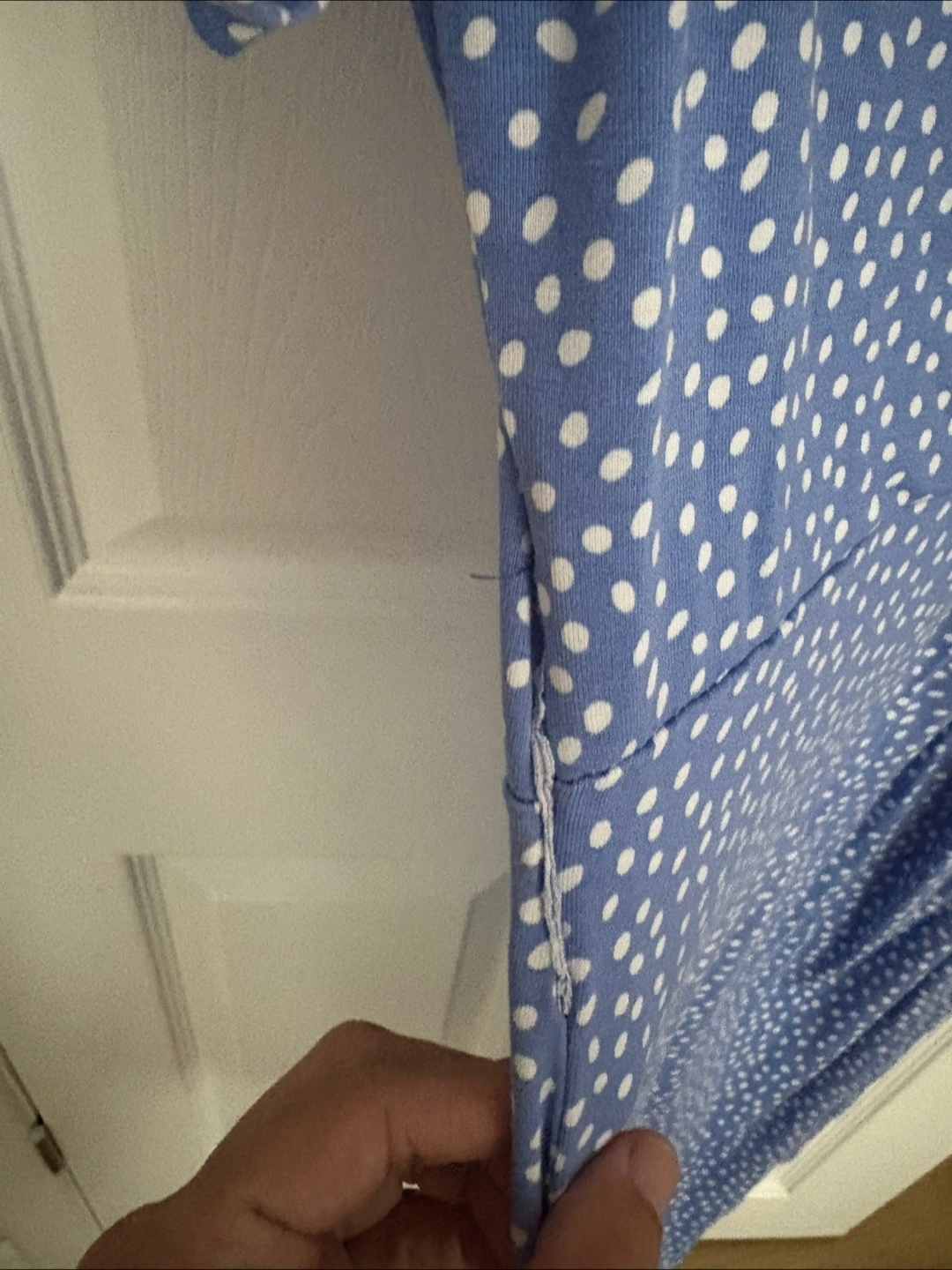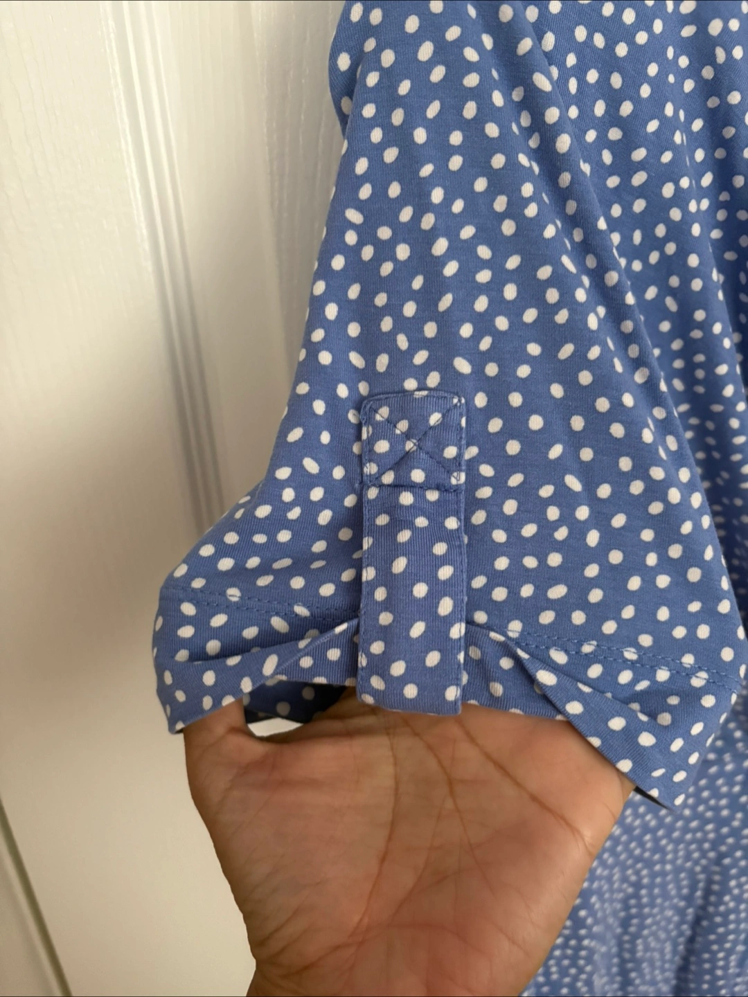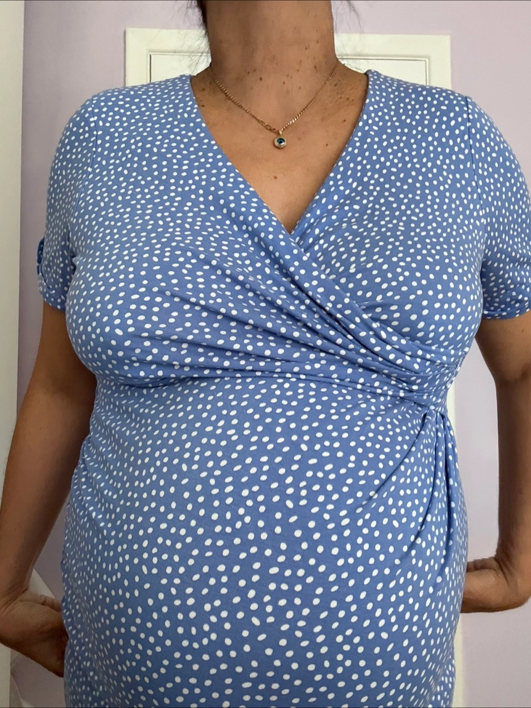 10This is a Seraphine maternity dress in a lovely blue with white polka dots. It's a size 8. Has been modified and no longer has tie at front