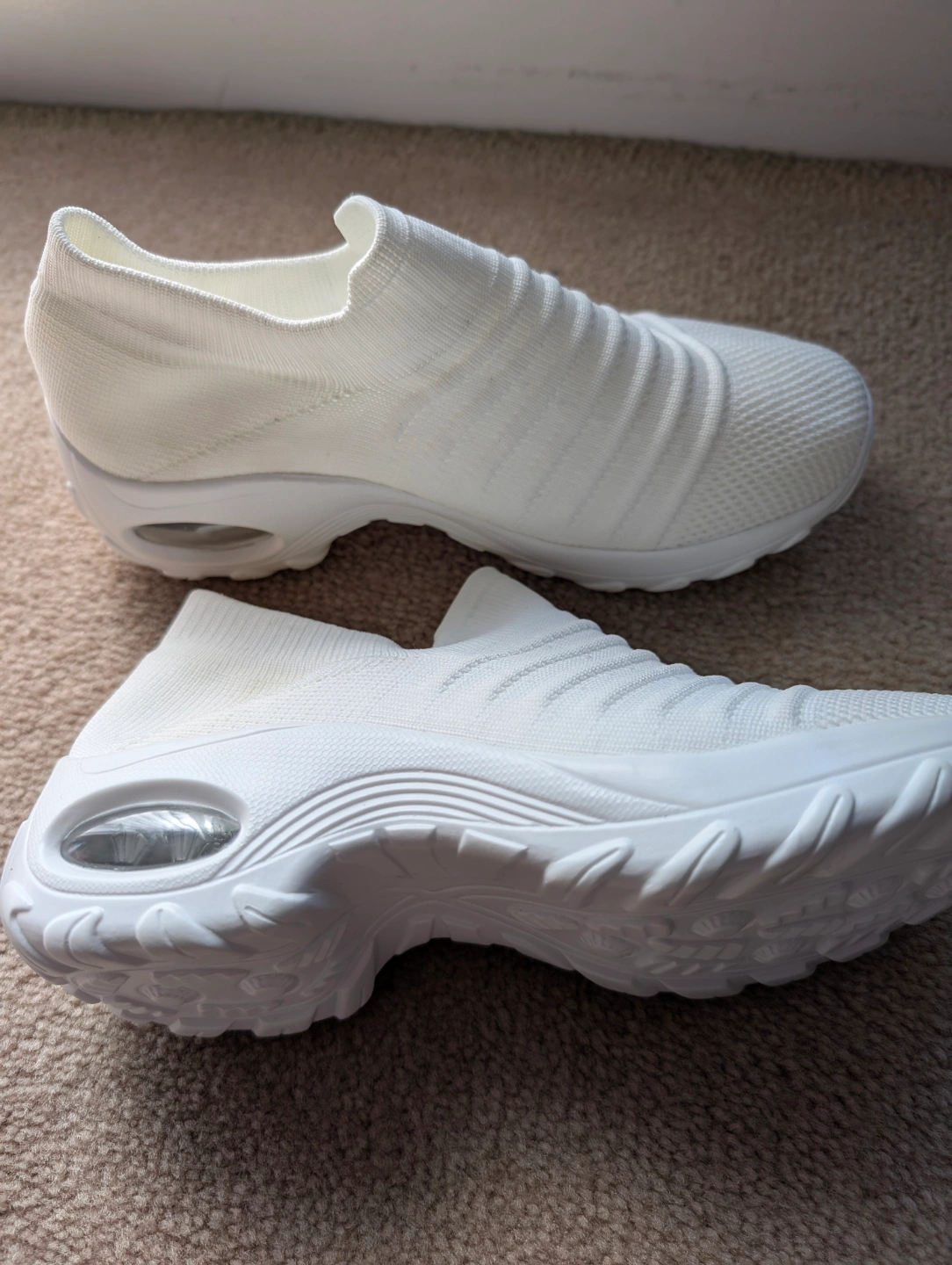 Comfortable slip-on design. White knit upper. Chunky platform sole. Lightweight and breathable. Great for everyday wear.