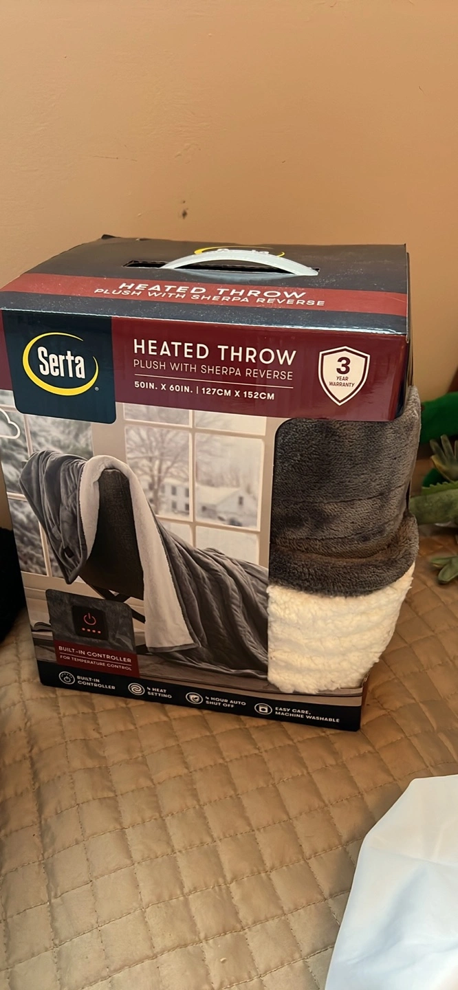 Heated throw blanket. Plush with sherpa reverse. Features built-in controller for temperature control. 4 heat settings. 4-hour auto shut-off. Machine washable.