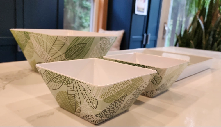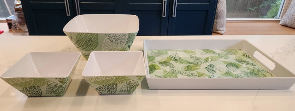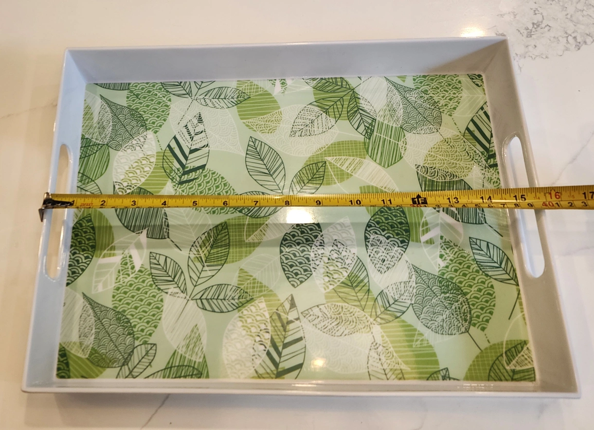 32Selling a lovely serving tray and bowls set featuring a refreshing leaf pattern. The tray measures approximately 16 inches long, perfect for serving snacks or drinks. The acrylic set includes 3 bowls to suit different needs.
