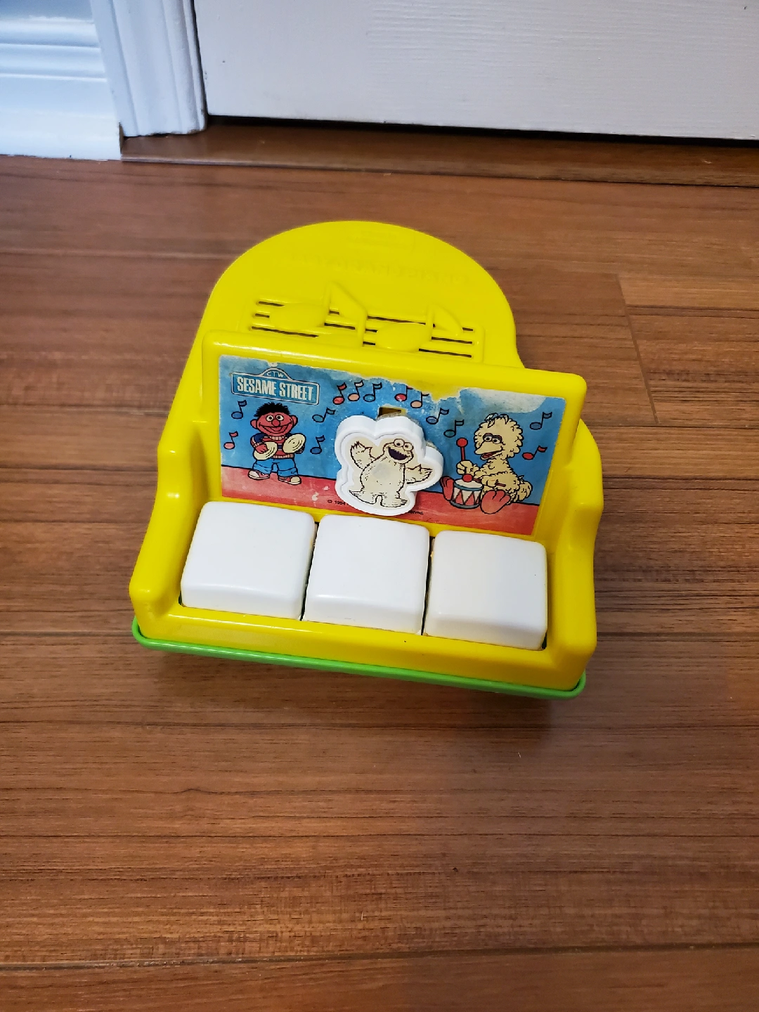 421offering a cute Sesame Street piano toy! It's yellow with white keys and features Elmo, Cookie Monster, and Big Bird. Great for little ones who love music and Sesame Street characters