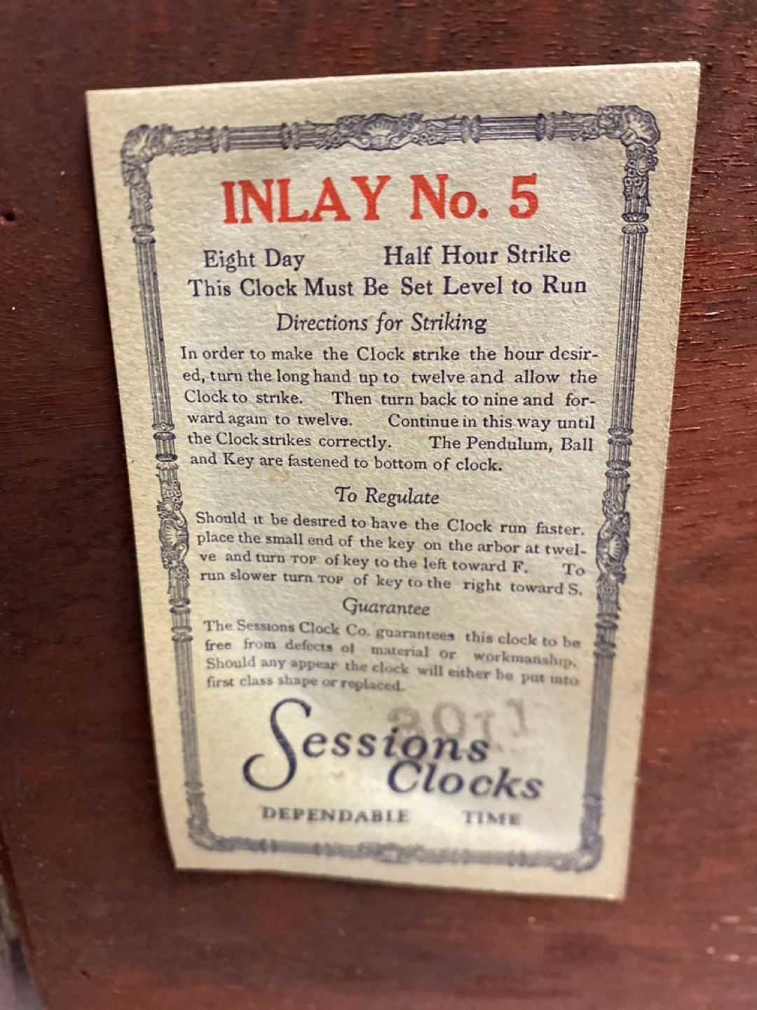31Selling a Sessions Clocks mantle clock, Inlay No. 5 model! It's an eight-day clock with a half-hour strike. The clock must be set level to run properly.