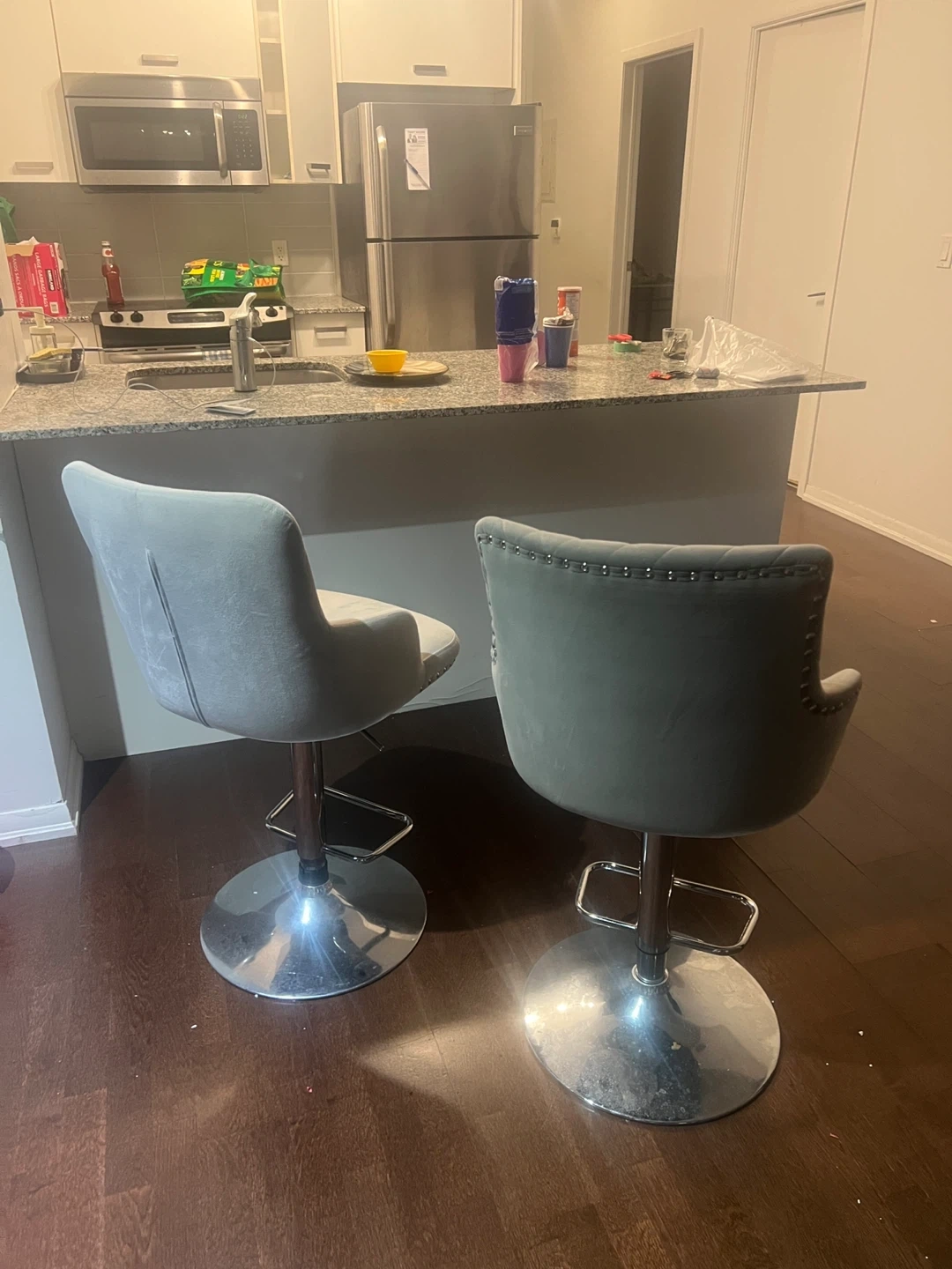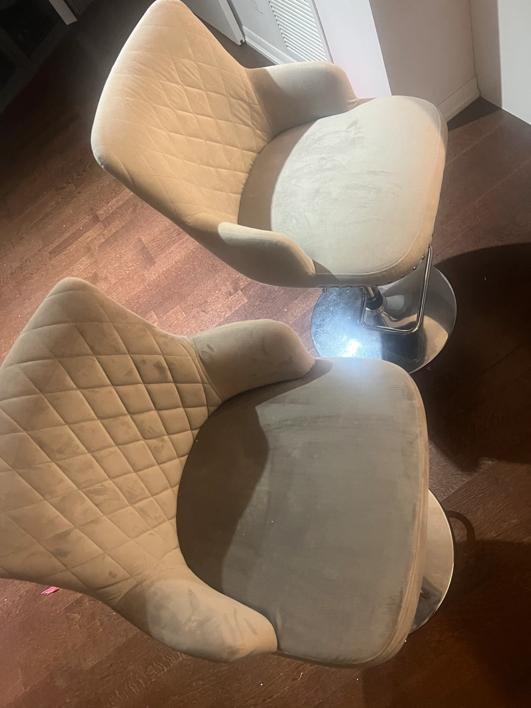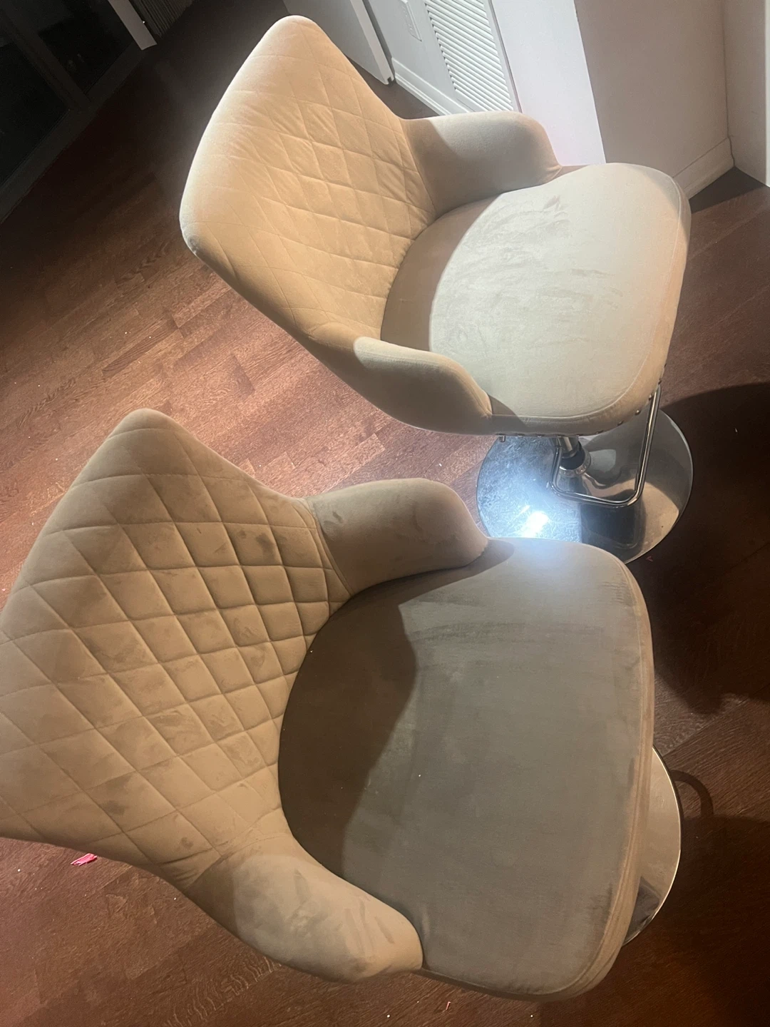 12Selling a set of two bar stools in great condition! They feature a swivel design and adjustable height, making them perfect for any kitchen island or bar area. The seats are upholstered in a soft, neutral-toned fabric with a quilted pattern, and the bases are chrome