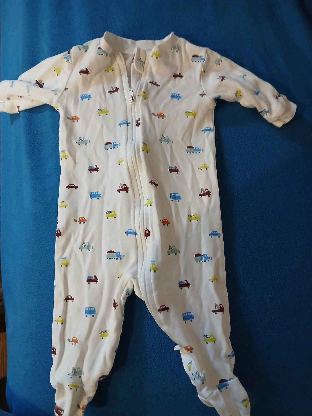 15Selling a practical set of two zippered footed sleepers (or "footies"), perfect for newborns. These are designed for comfort during sleep and make diaper changes quick and easy. Item Details: Size: 0-3 Months (as seen on the George tag). Material: 100% Cotton (from the George tag) – soft, breathable fabric ideal for delicate baby skin. Key Feature: Both sleepers have a long zipper (instead of snaps) running down the front, which allows for very fast dressing and changing, especially helpful during nighttime wake-ups.