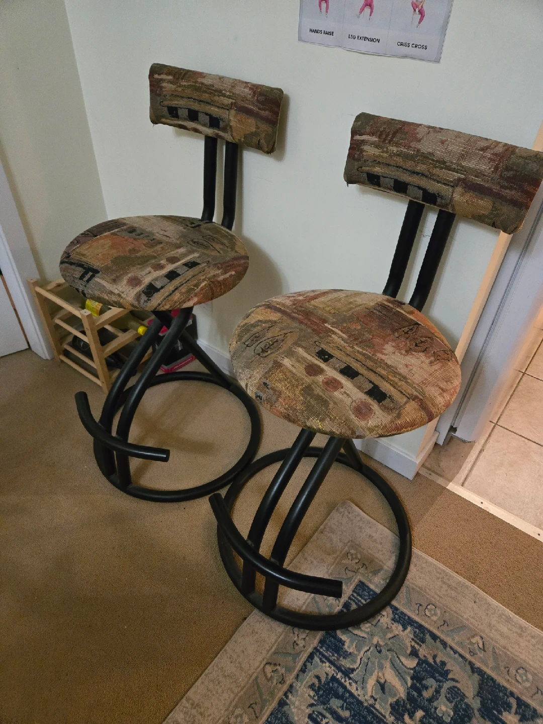 10Selling a set of two bar stools. They have a unique design with a black metal frame and patterned fabric seats and backrests. They are in good condition and would be a great addition to any kitchen or bar area