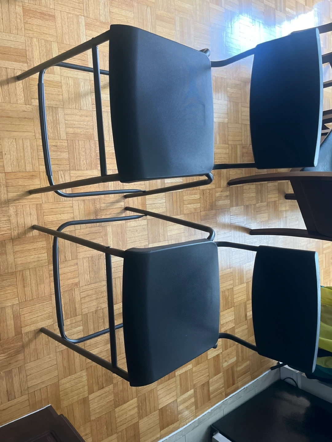 Selling a set of two black kitchen counter or bar chairs! They're in great shape and perfect for extra seating around the house. The chairs are easy to store since they stack nicely, saving you space when they're not in use