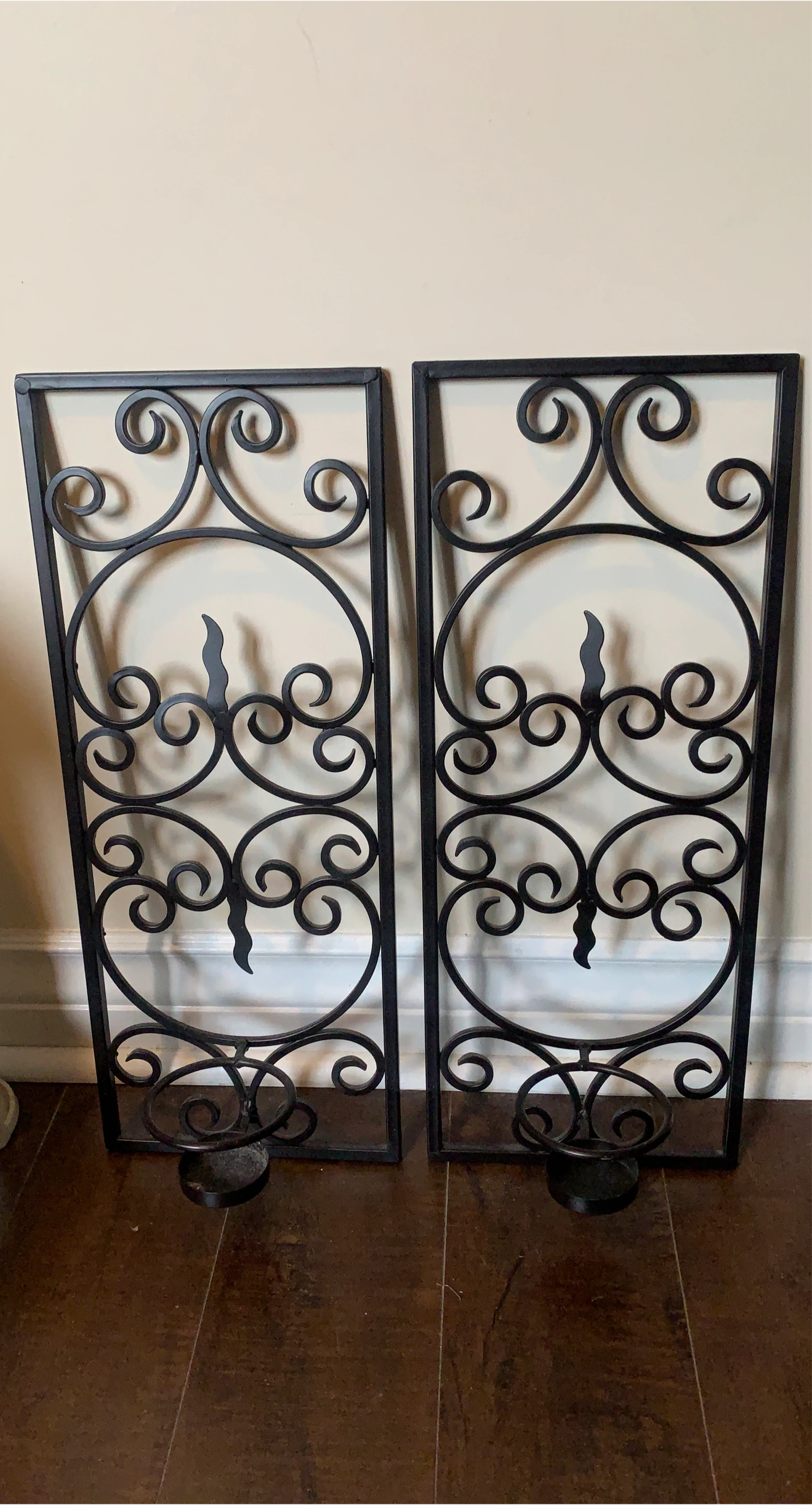 15Selling a set of two black metal candle holders. They feature a decorative, ornate design. Perfect for adding a touch of elegance to any room!