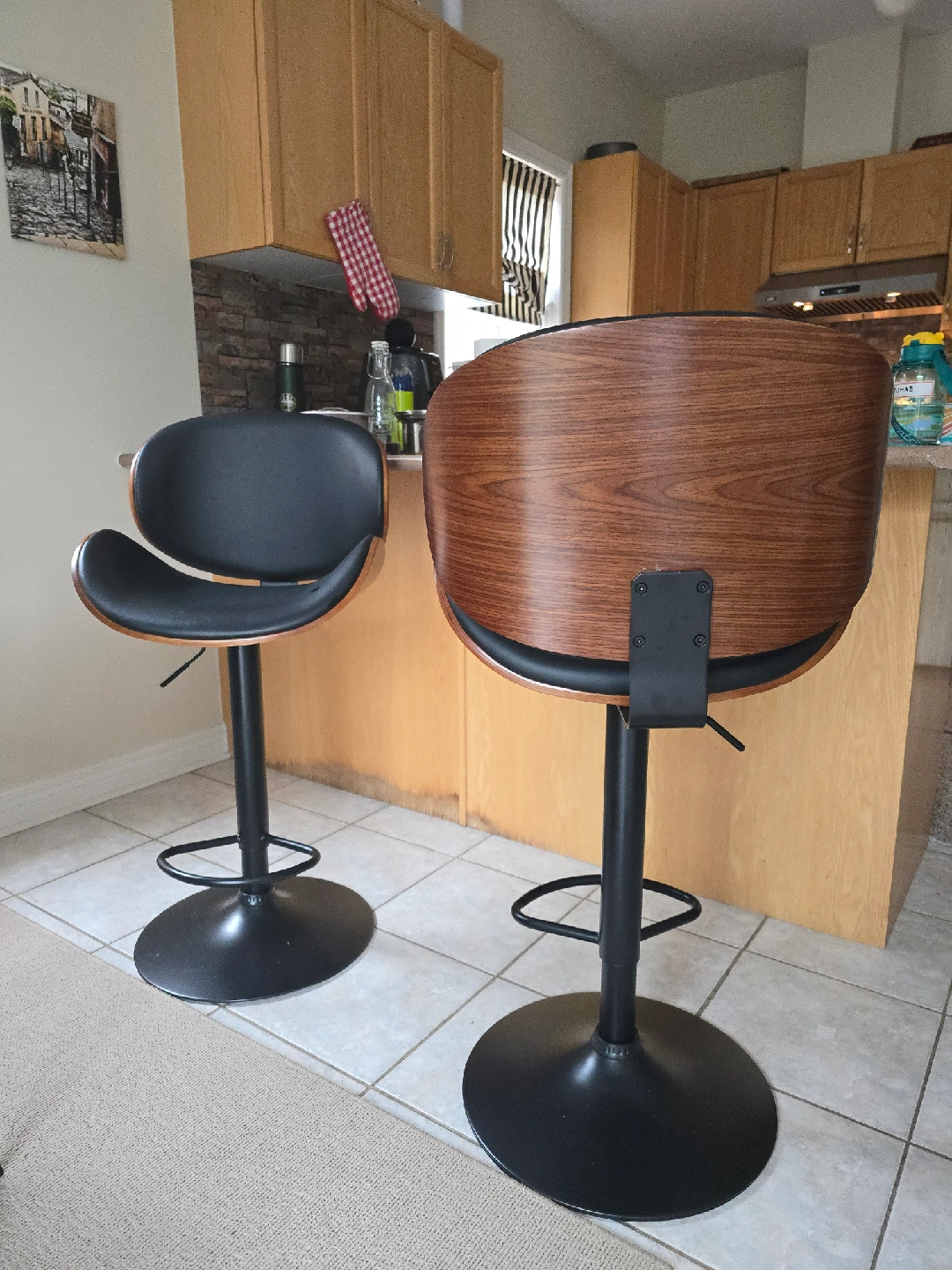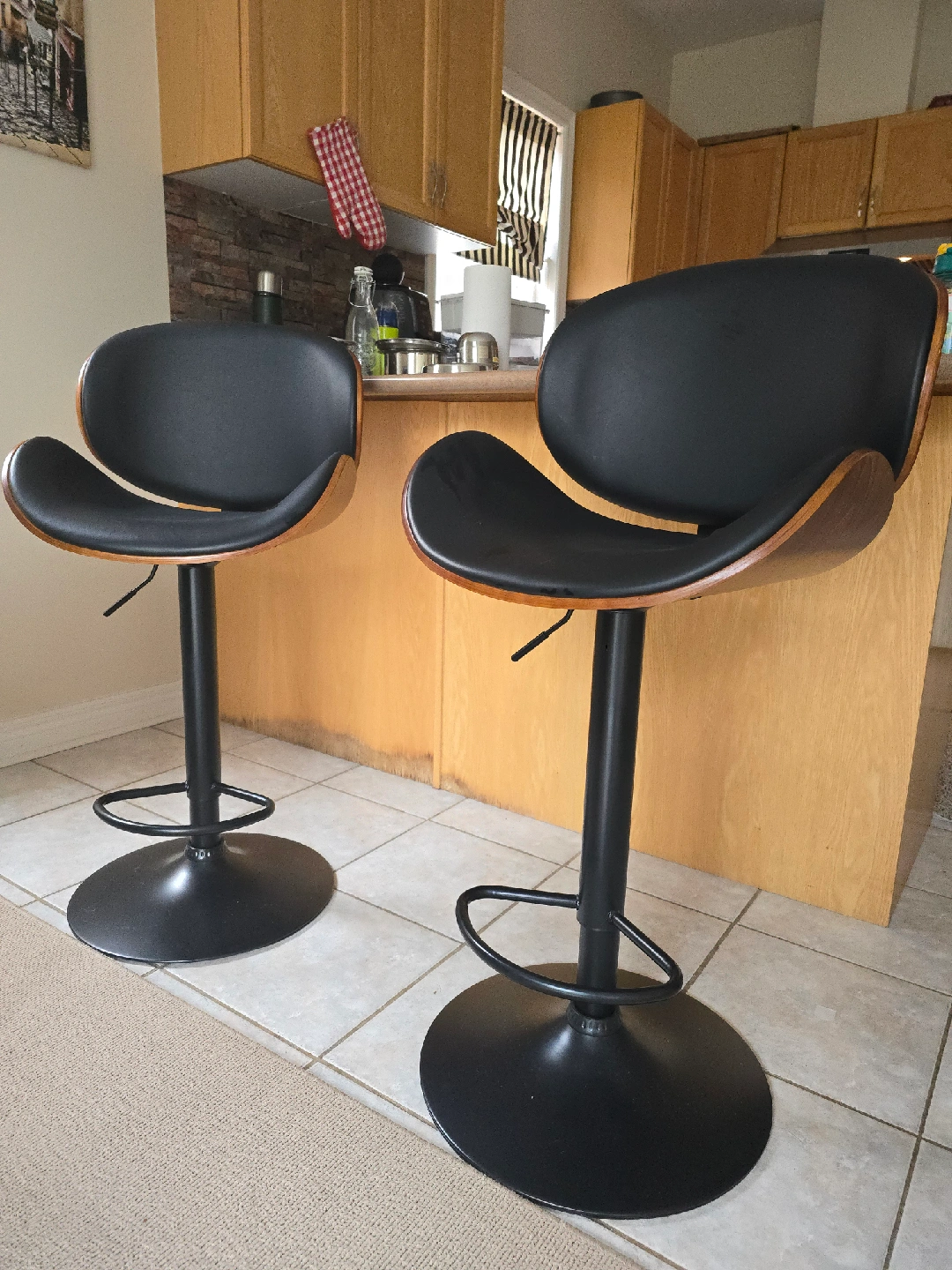Selling a set of two stylish bar stools! They feature a sleek black seat and a beautiful wood back. Perfect for adding a modern touch to your kitchen or bar area. They're in great condition and ready for a new home
