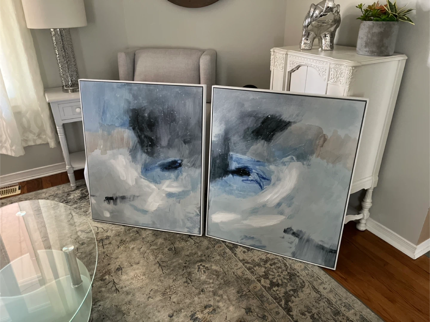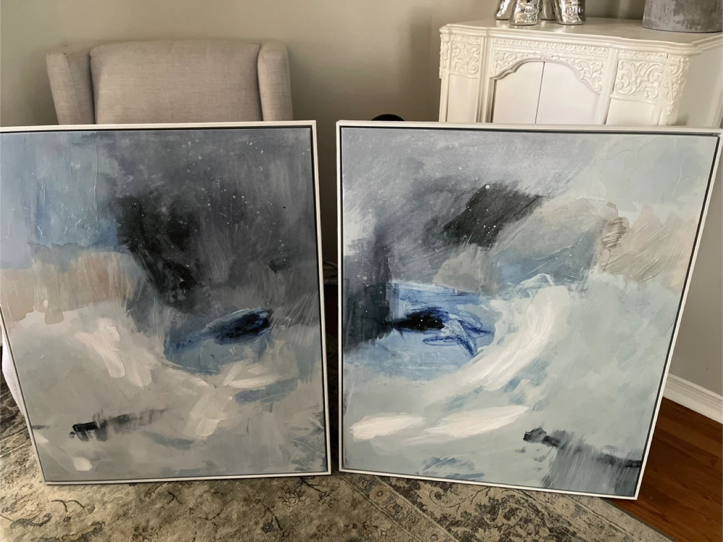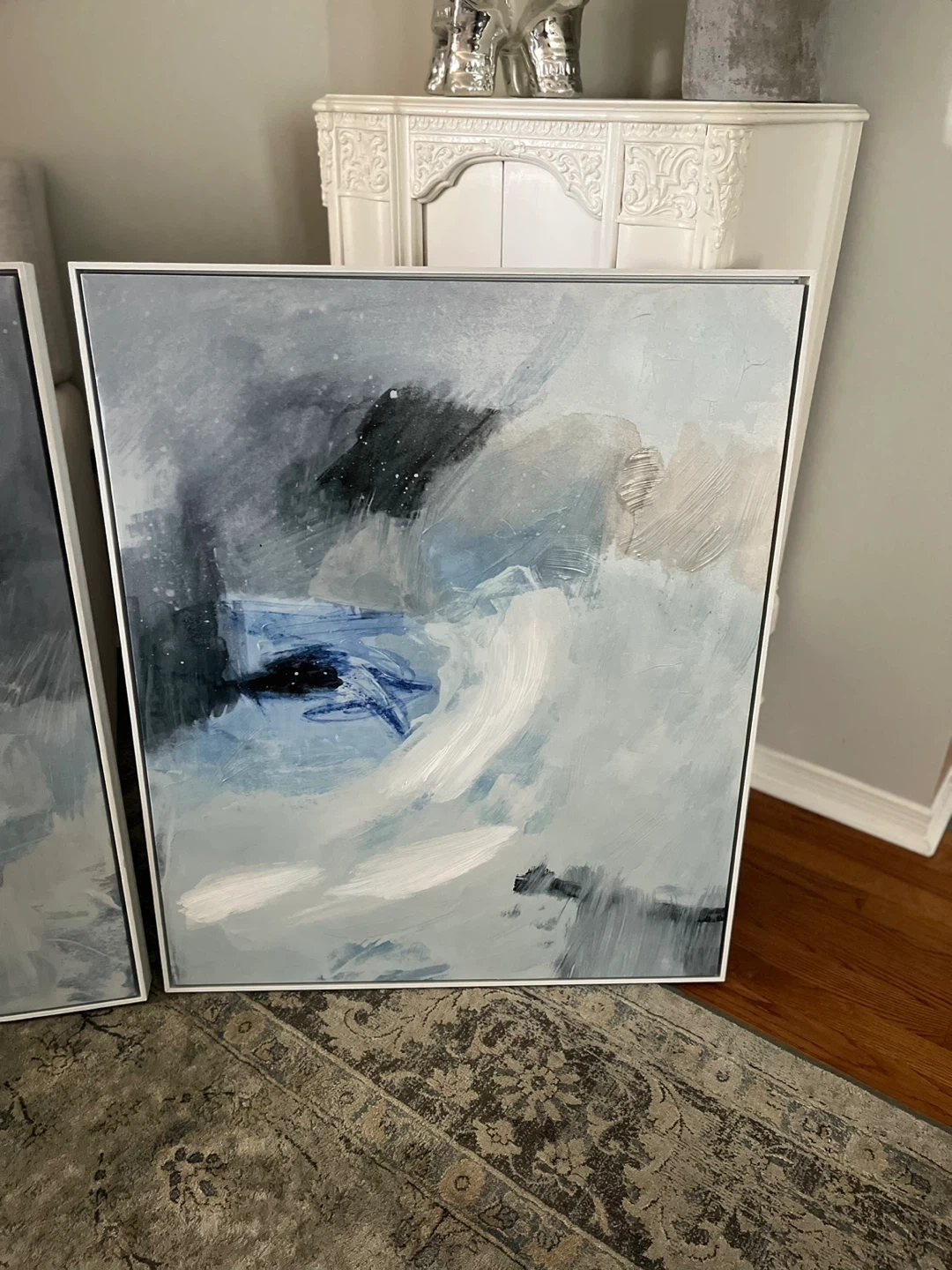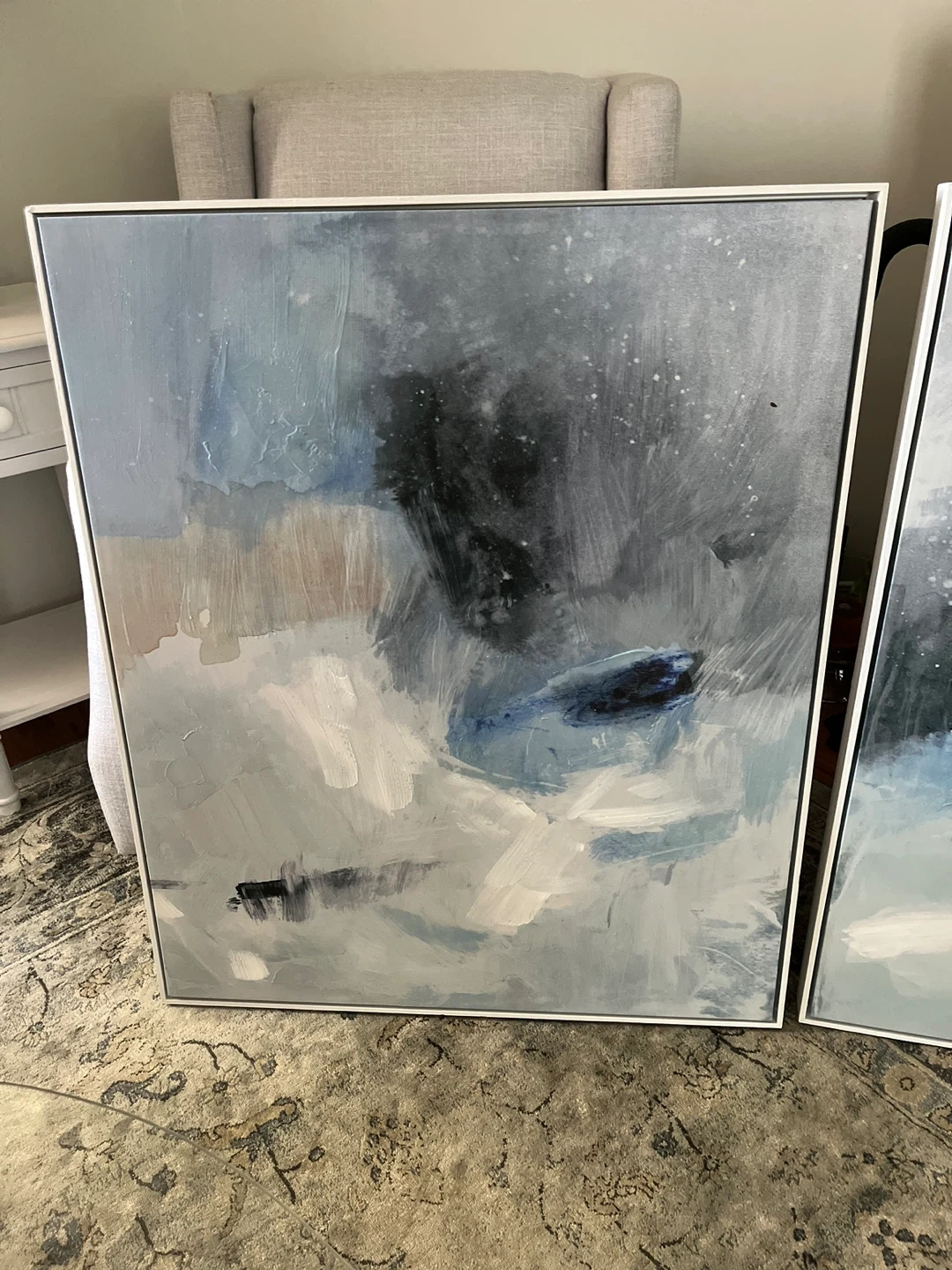 Selling a set of two framed abstract art prints. They feature a beautiful blend of blues, greys, and whites. These pieces would add a touch of modern elegance to any room! Each print 30”W x 36”h