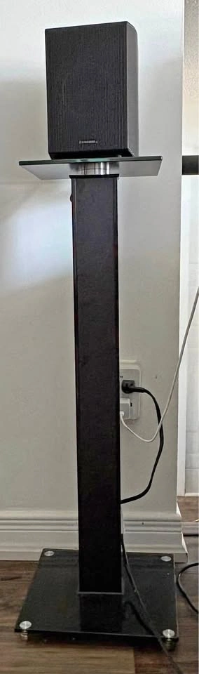 10This is a sturdy and modern speaker stand suitable for bookshelf speakers and small wireless units. It’s a set of 2 The design features a sleek black finish, a stable weighted base with metal foot pads, and a cable management groove for a clean look. The top glass plate accommodates most standard speaker sizes. Perfect for home theater setups, living rooms, or studio use. Speaker is not included; only the stand is for sale.