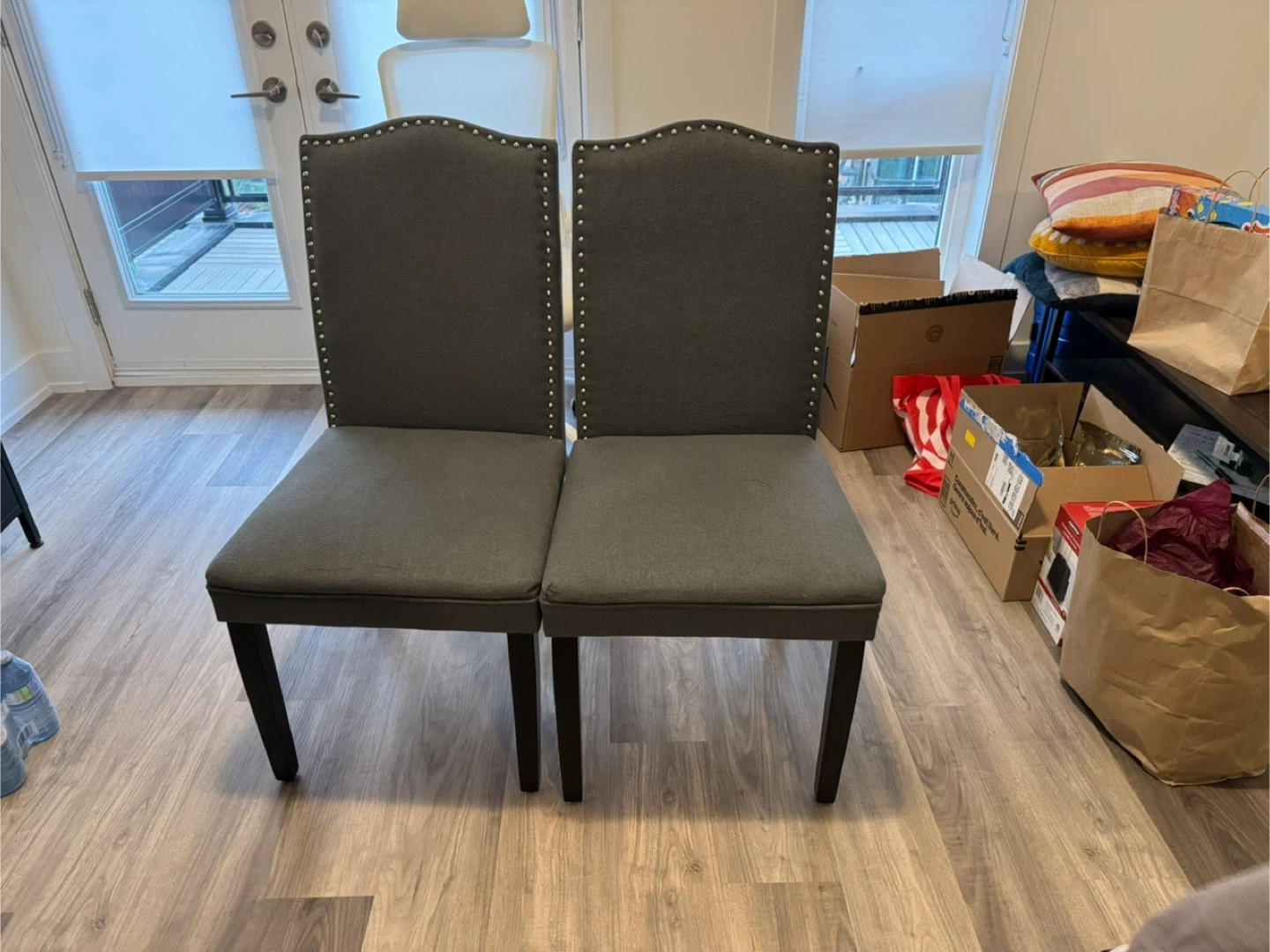 68Selling a set of two dining chairs. They are a neutral grey colour and would fit in well with most decor styles. The chairs have a nice studded detail around the back. They're in great shape and ready for a new home
