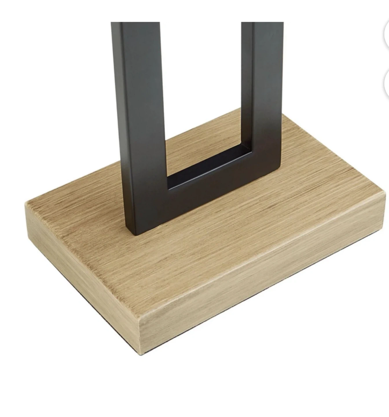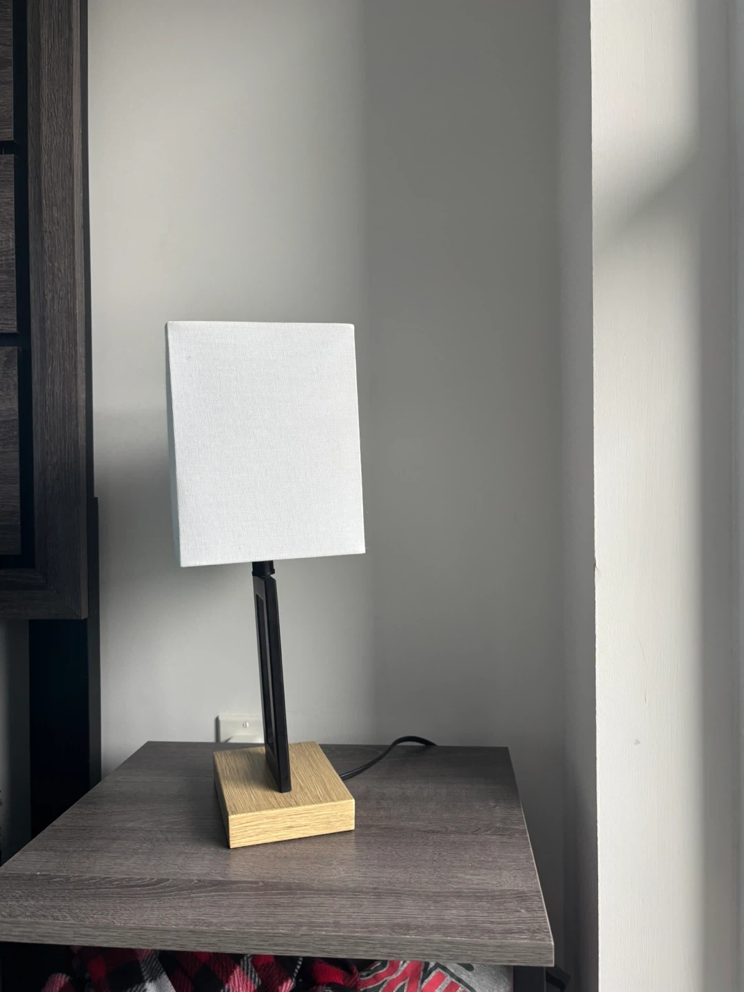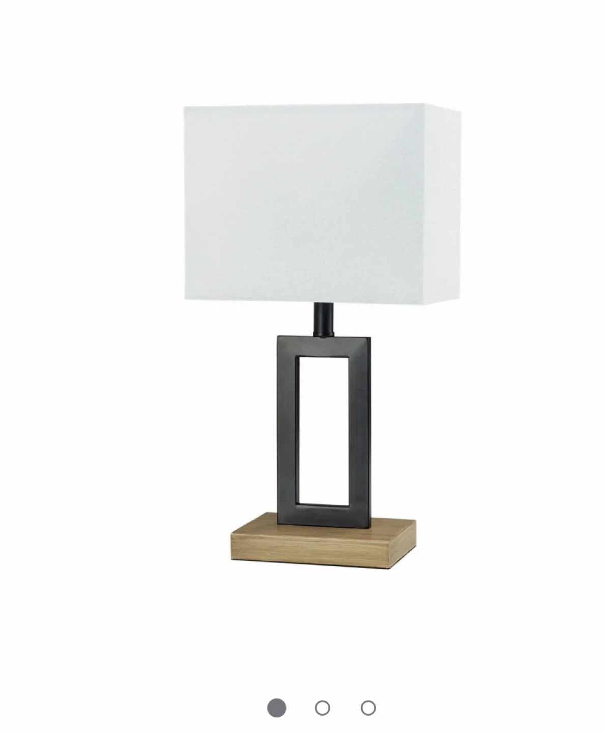 52Selling a modern table lamp with a black frame and a white rectangular shade. It has a wooden base and would look great in any room! The lamp is 16 inches tall, 9 inches wide, and 5.5 inches deep