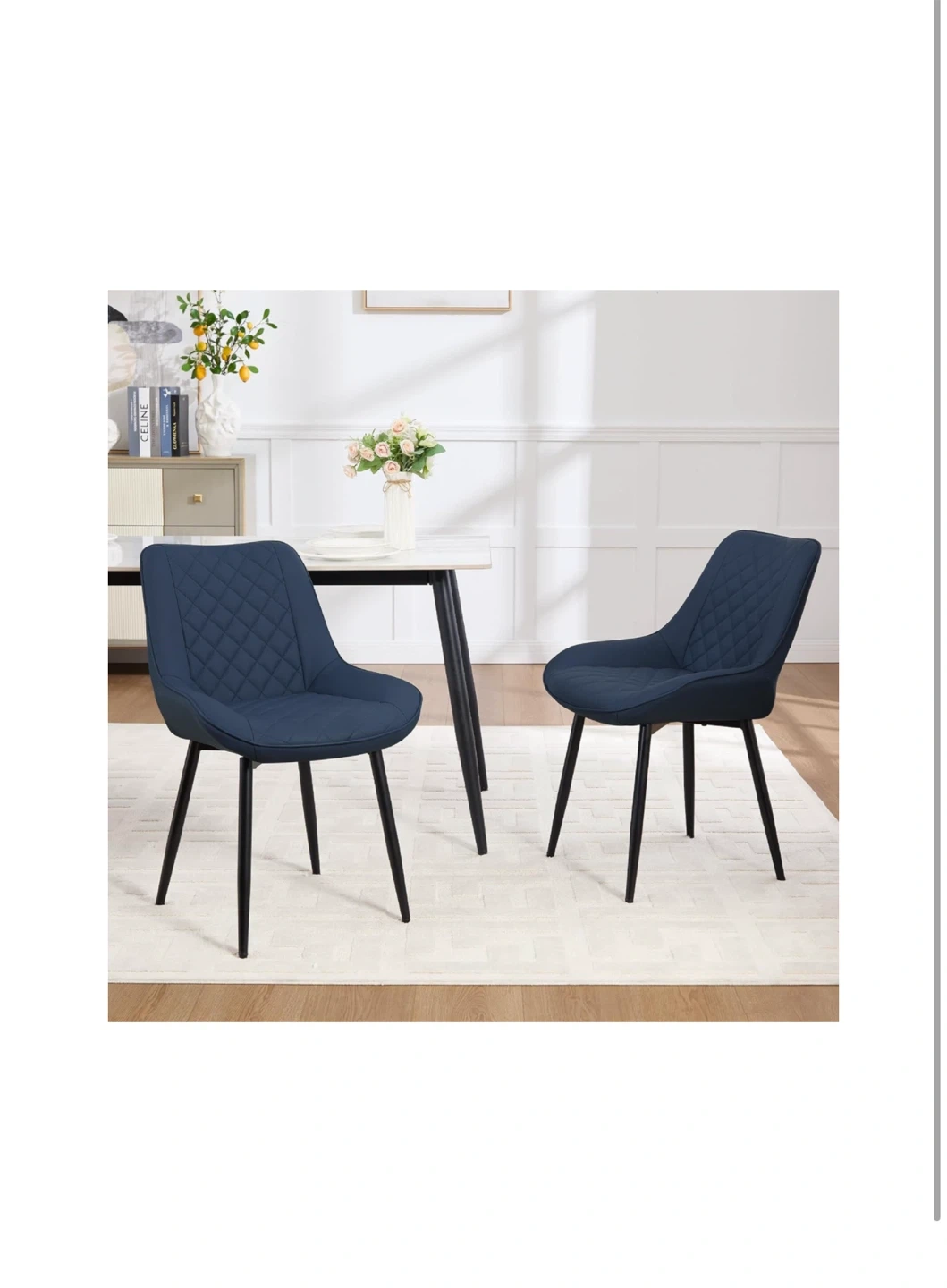 10Selling a set of two navy blue dining chairs! They have a quilted pattern on the back and seat, adding a touch of elegance to any dining space. Key specs: - Dimensions: 15" wide, 14" high, 19.7" deep - Seat height: 18.1" - Weight capacity: 300 lbs